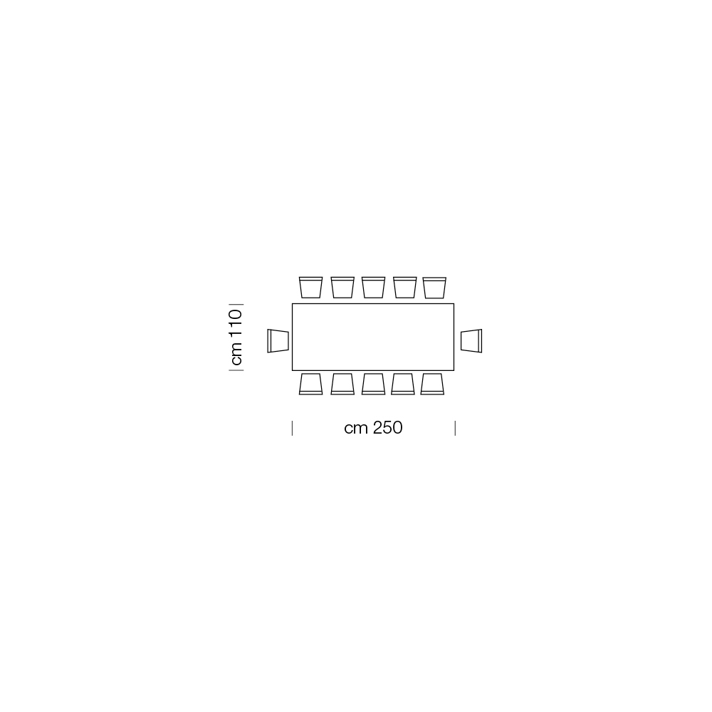250 cm de largo x 110 cm de profundidad x 75 cm de alto. 12 plazas.