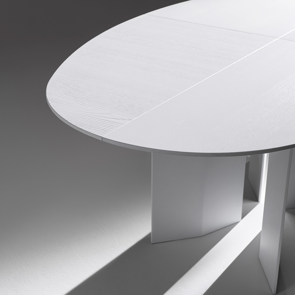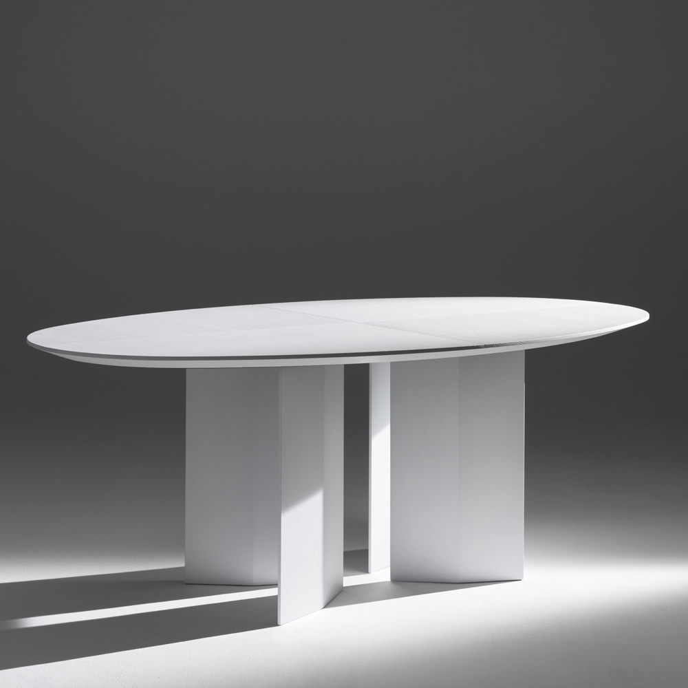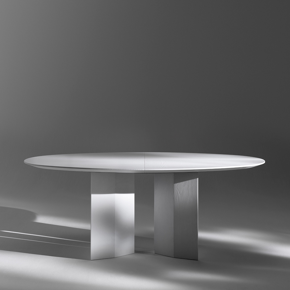Esta mesa de comedor ovalada destaca por su diseño escultural y esencial, donde volúmenes amplios y proporciones equilibradas crean un mueble visualmente impactante. El tablero ovalado interactúa con la base central, creando una composición sólida y armoniosa, diseñada para espacios contemporáneos y refinados.