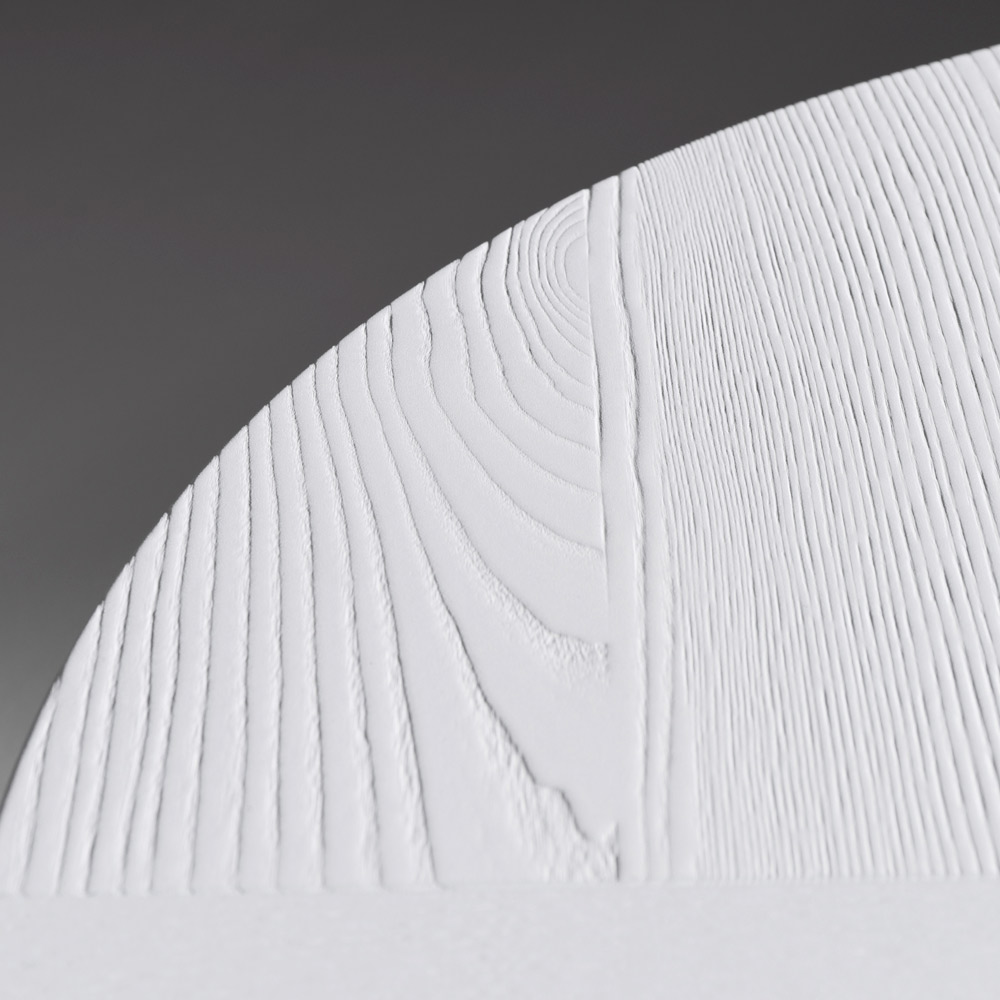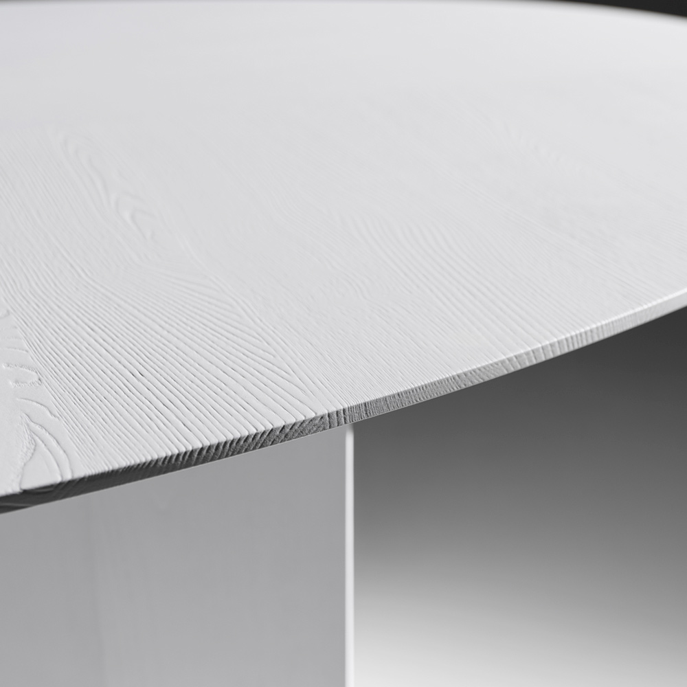 Fabricada con contrachapado de fresno termotratado , la mesa realza la veta natural de la madera, realzando su textura y profundidad cromática. También está disponible en laca blanca o negra , lo que la hace versátil y se adapta a diversos estilos, desde minimalistas hasta atrevidos y gráficos.