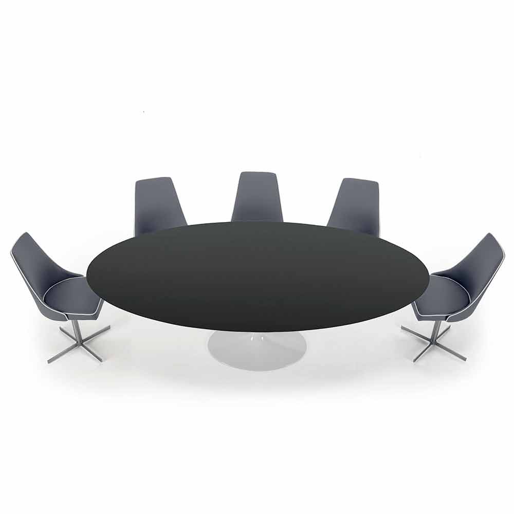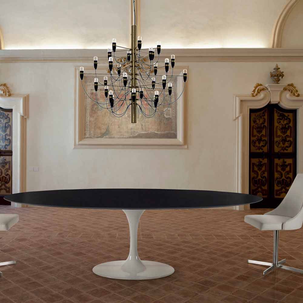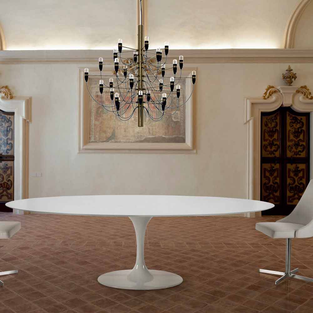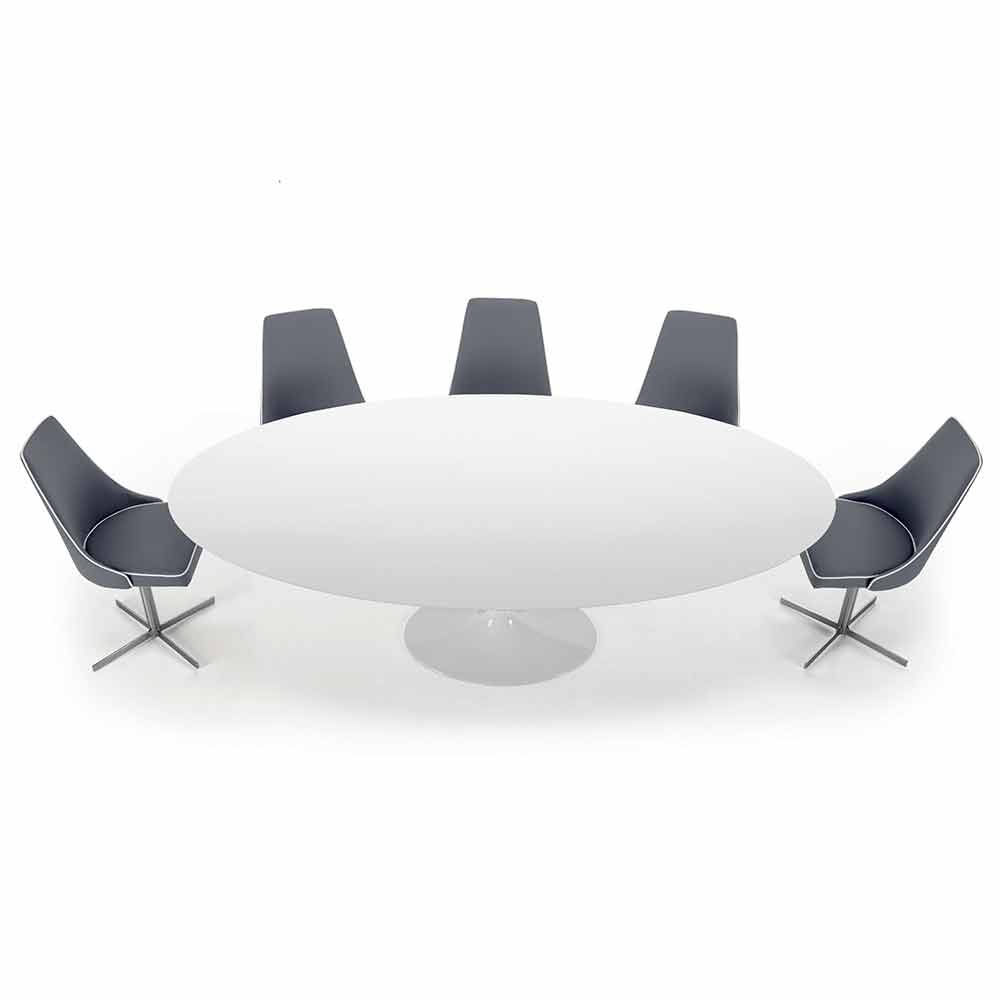 Mesa de comedor con tapa ovalada en laminado líquido fabricada en Italia, de alta calidad.