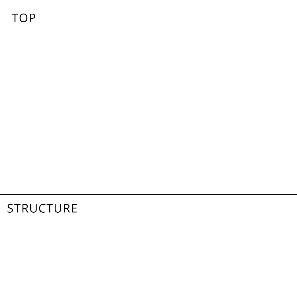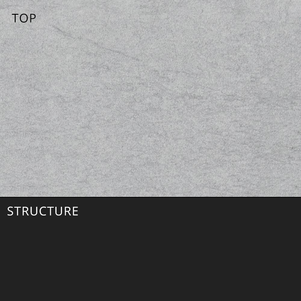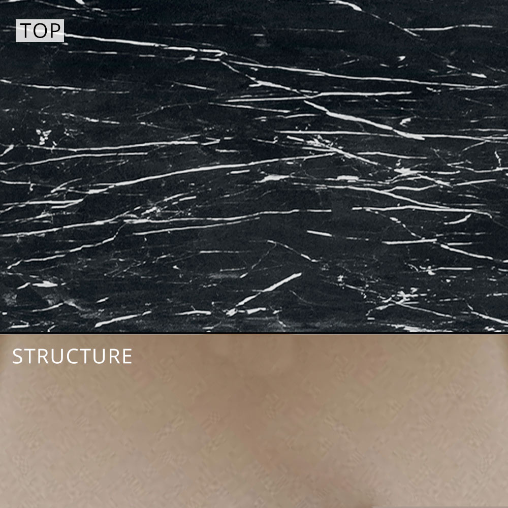 La estructura es de aluminio con recubrimiento de polvo epoxi , combinado con la tapa rectangular en gres de 12 mm de espesor o en los colores del laminado HPL de 10 mm de espesor.