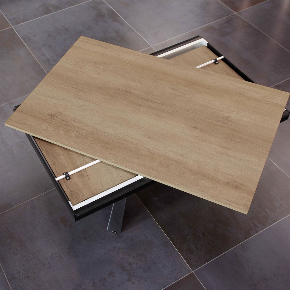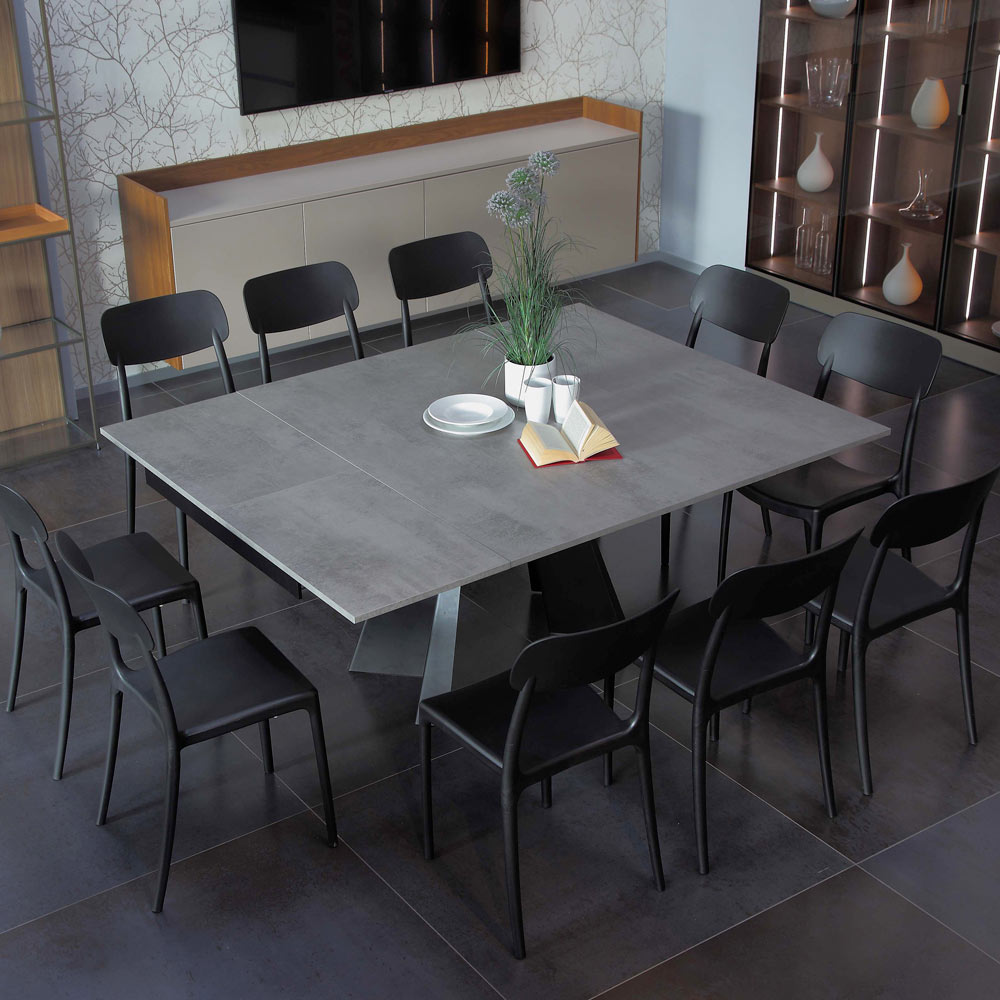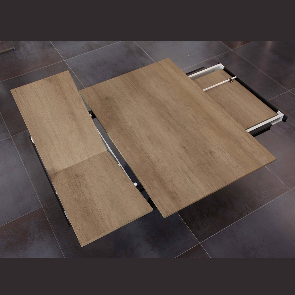 Mesa de comedor realizada con tapa de melamina, base de metal pintado de negro con guías y estructura estructural íntegramente en aluminio. Este artículo de diseño moderno es perfecto para incluir en zonas de estar, cocinas y salones con un estilo elegante y contemporáneo. La posibilidad de ampliarse y ampliarse permite que se adapte a todas las necesidades y ocasiones de uso, para invitar a amigos y familiares y crear momentos de convivencia únicos e inolvidables.