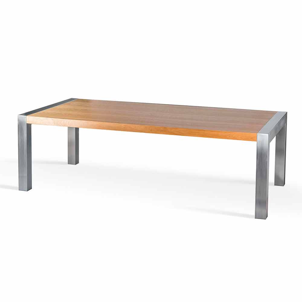 mesa de comedor rectangular en estafas de roble y acero inoxidable