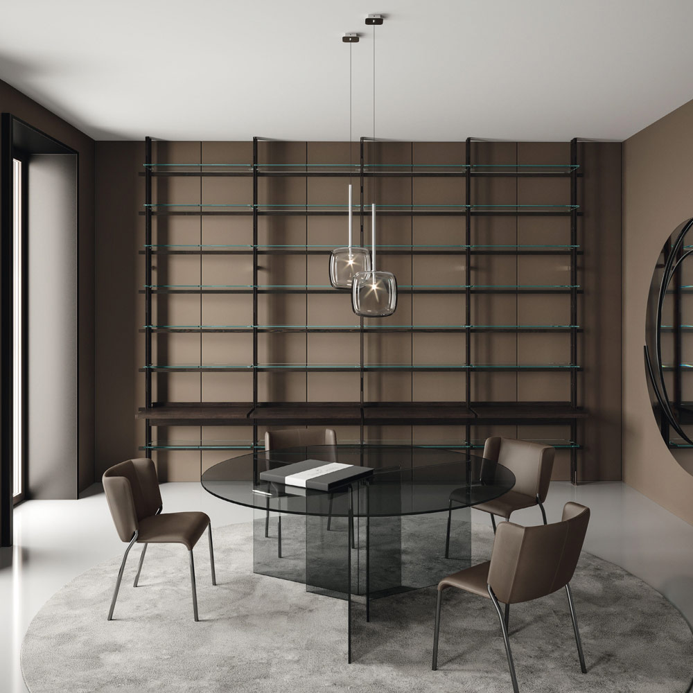 Mesa de comedor realizada íntegramente en cristal ultrarresistente con tapa redonda . Un complemento con un carácter refinado que proviene de un proceso de producción 100% Made in Italy gracias a expertos artesanos expertos en el procesamiento del vidrio, un material único que da vida a una preciosa mesa de diseño.