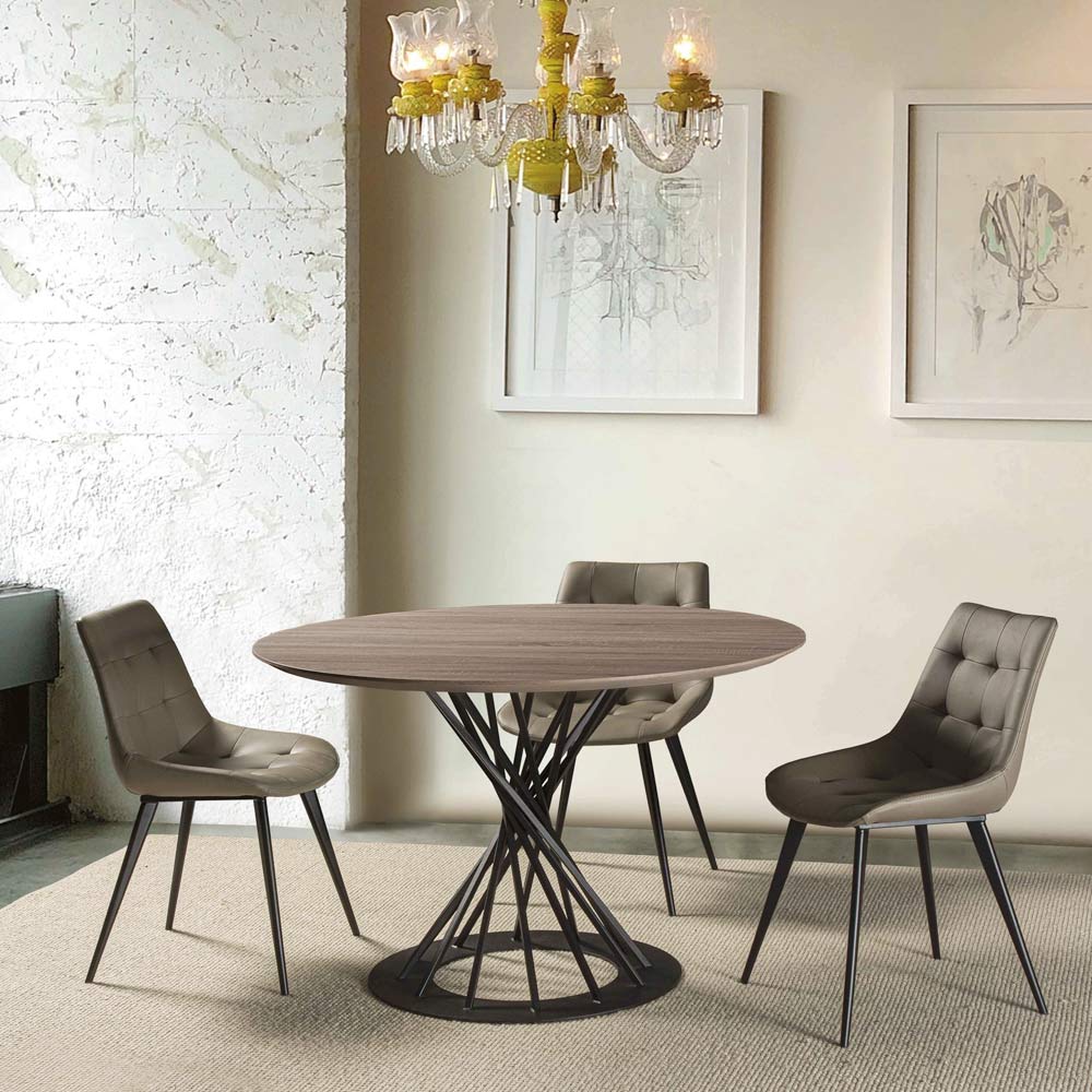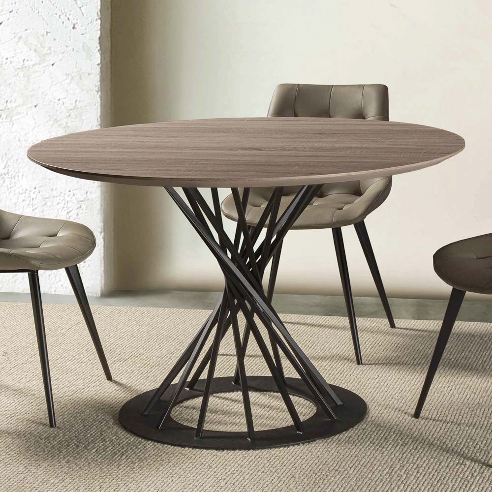 Mesa de comedor redonda con tapa de madera laminada y base de acero, diámetro 120 cm.