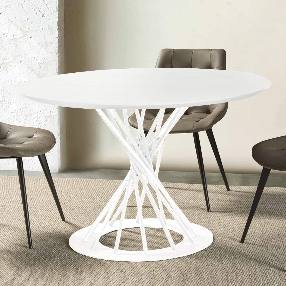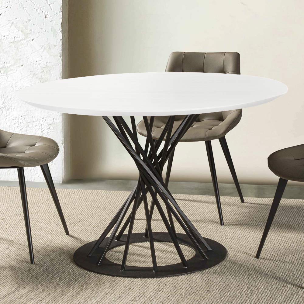 Mesa de comedor moderna con tapa redonda de madera laminada (h 30 mm)con borde acampanadoy base en acero pintado . La maravillosa combinación de estos dos materiales contribuye a dar vida a un artículo elegante caracterizado por unas dimensiones contenidas que lo convierten en una elección perfecta para quien dispone de pequeños espacios pero no quiere renunciar a un artículo moderno caracterizado por un carácter innovador y vanguardista. estilo . La particular estructura de la base junto con la elección del tablero redondo confieren al producto una espléndida armonía entre las formas y una sensación de movimiento que junto con los acabados disponibles hacen que la mesa sea única y con un marcado carácter contemporáneo .
