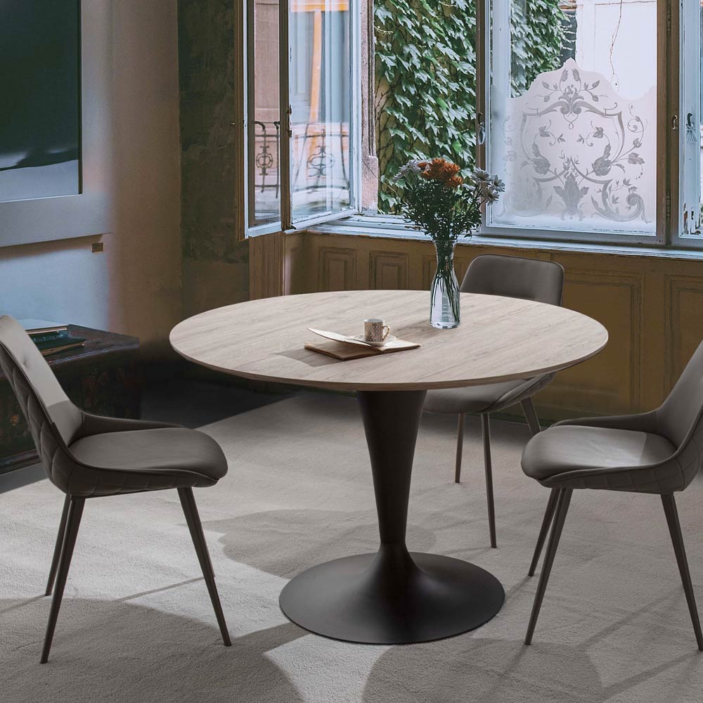 Maravillosa mesa de comedor con tapa redonda en madera laminada chapada (h 30 mm), acabado de roble texturizado con borde acampanadoen mdf y base en acero pintado negro . Elegancia y funcionalidad son las palabras clave que mejor describen este mueble moderno que encarna un aspecto extremadamente contemporáneo capaz de enriquecer la estética de la habitación manteniendo dimensiones bastante pequeñas y, por lo tanto, resulta ideal para aquellos que tienen espacios limitados disponibles pero no quieren dar amueblarlos de una manera sofisticada y elegante. Ideal para completar cualquier ambiente con sobriedad, esta mesa también es extremadamente versátil , gracias a la combinación perfecta de acabados simples y esenciales.