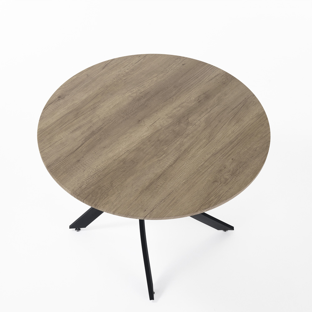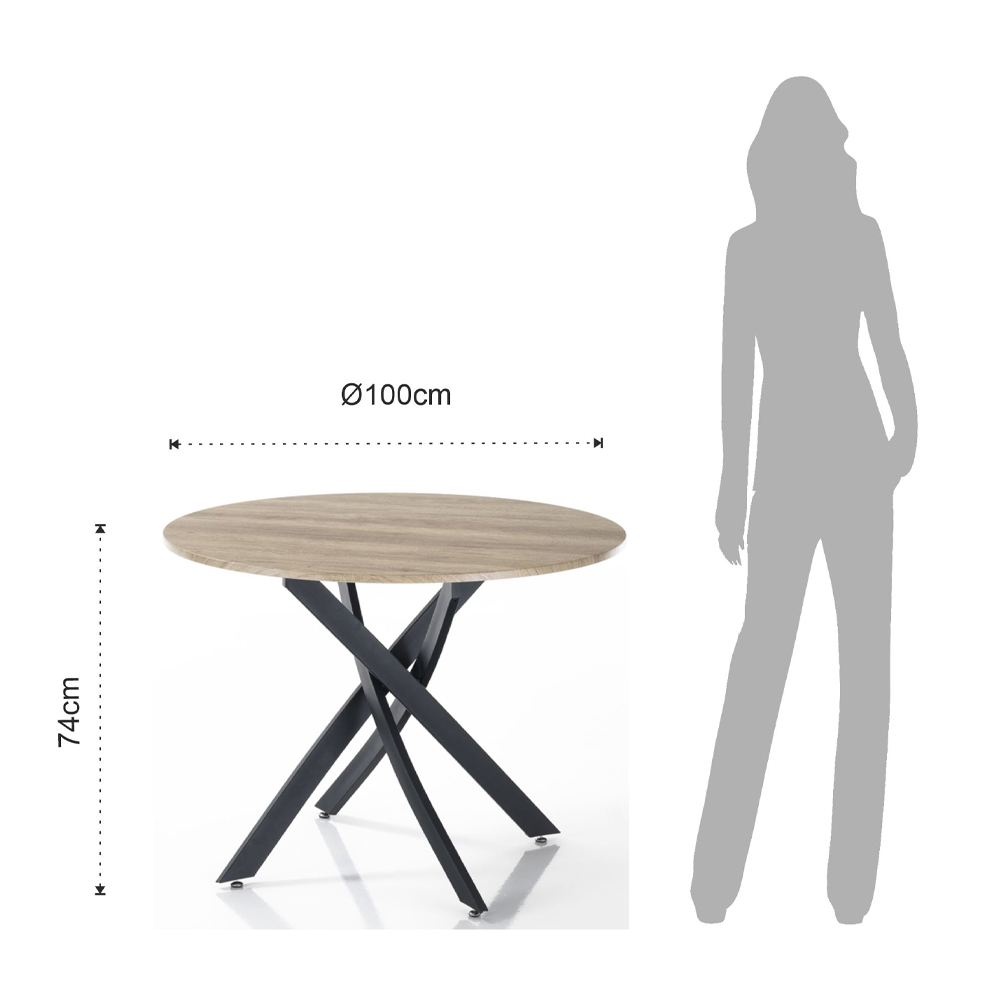 Mesa de interior con tapa redonda fabricada en MDF revestida en melamina acabado roble espesor . 18 mm, base fabricada en acero pintado negro mate , íntegramente . Este producto es la idea perfecta para todos aquellos que quieran dar un toque de modernidad y frescura a la estancia, ya sea un salón, una cocina o un ambiente contract. Los materiales elegidos para la construcción son de primera calidad para garantizar al cliente una mesa no sólo estética sino también funcional y resistente , que desprende toda la artesanía.