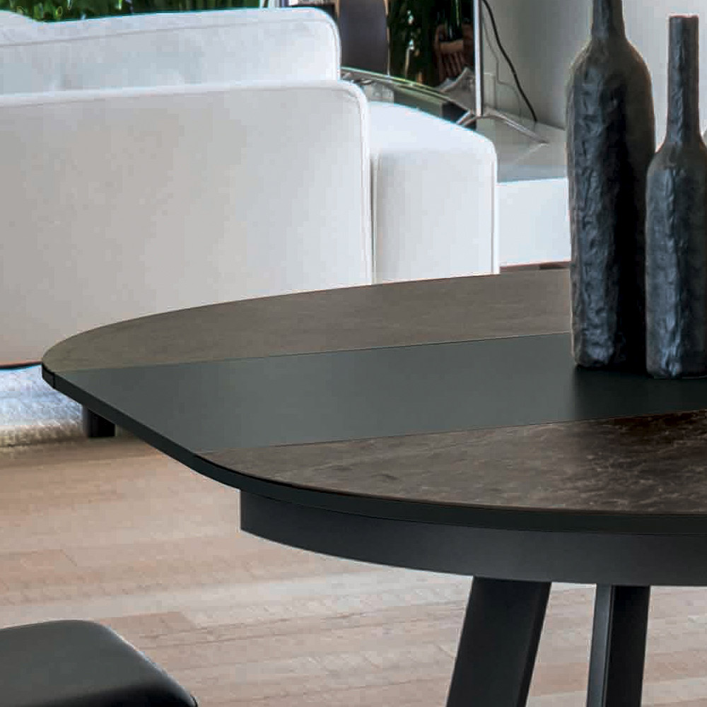 Mesa de comedor realizada a través de una producción artesanal 100% Made in Italy con estructura de metal pintado en grafito gofrado y tapa redonda de cerámica que se divide en dos semiplanos para acomodar las 3 extensiones externas, aumentando así la superficie y las oportunidades para la convivencia.
