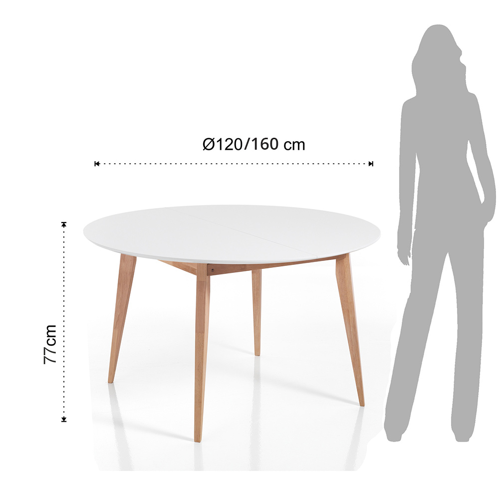 Mesa de comedor con tapa redonda extensible fabricada en mdf lacado en blanco mate (3 cm de espesor) y patas en madera maciza con acabado roble blanqueado . Un producto con un diseño simple y limpio, ideal para quienes aman un estilo de mobiliario esencial y versátil capaz de completar el estilo de su comedor o cocina con gusto y personalidad. Su punto fuerte está representado por la tapa extensible que, gracias a una extensión de 40 cm cada una, alcanza una longitud de 160 cm.