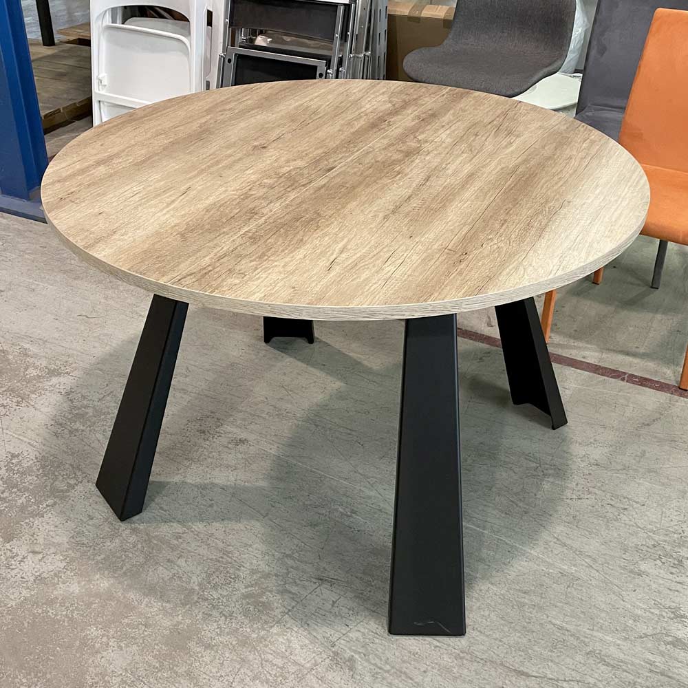 Mesa de comedor redonda extensible hasta 370 cm en melamina madera y metal.