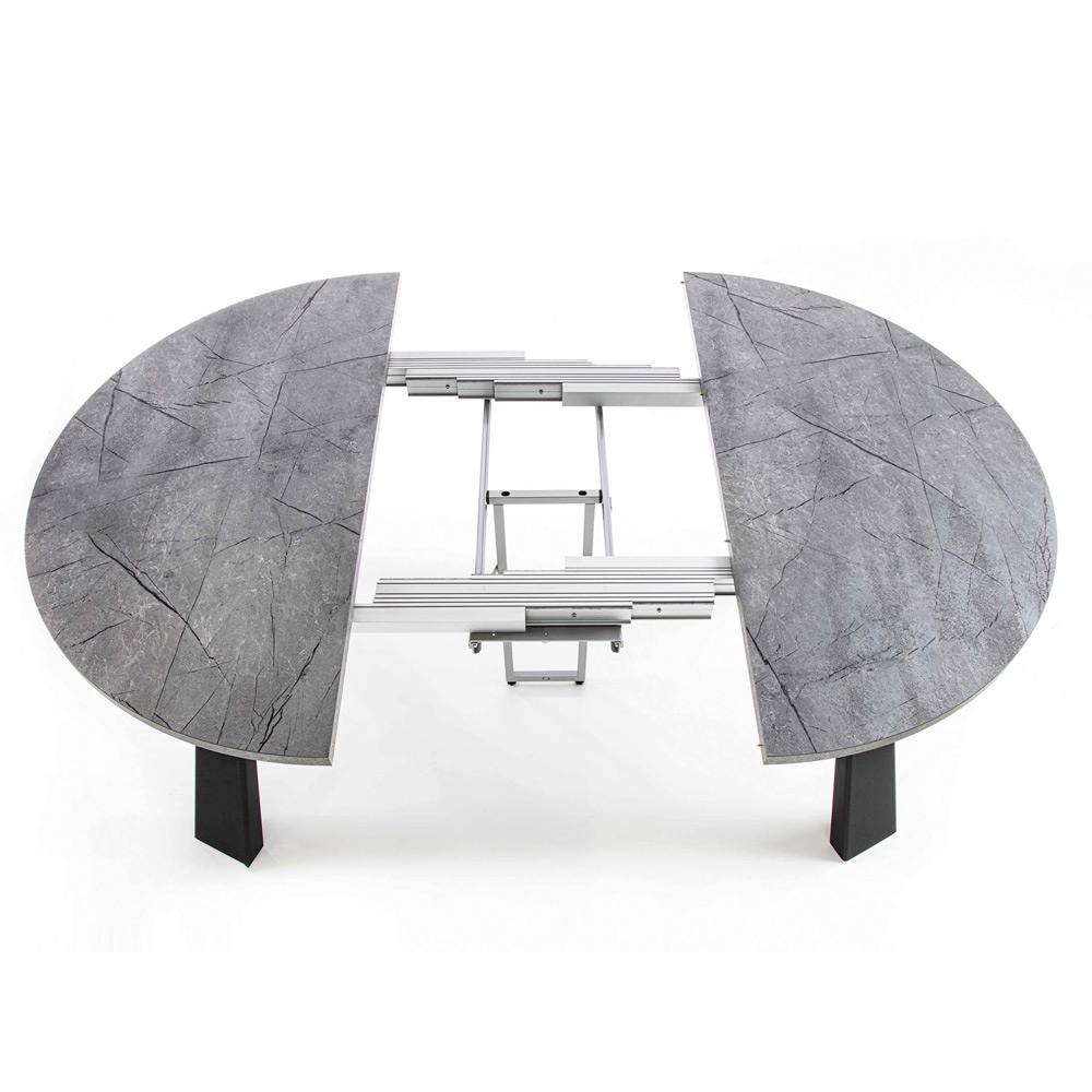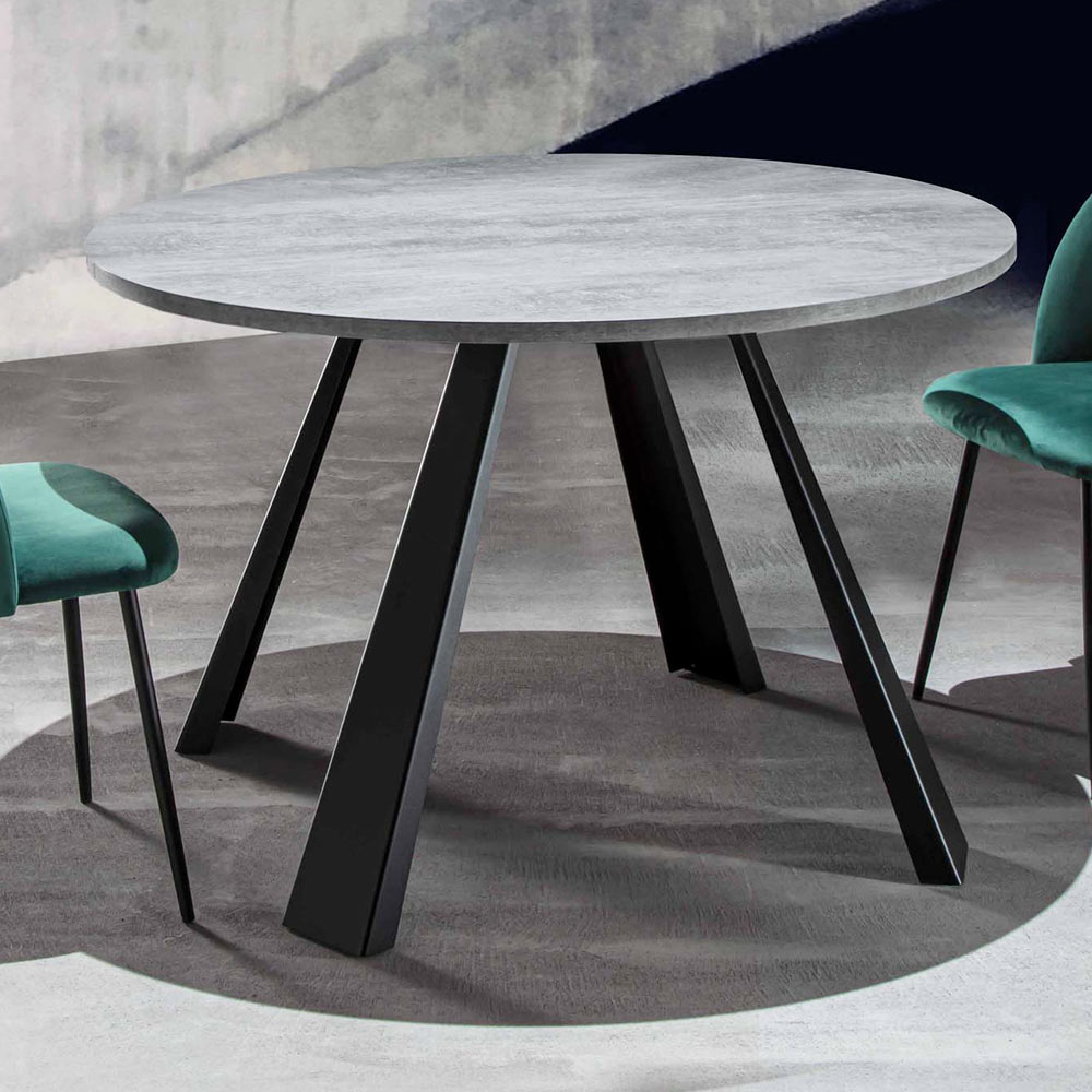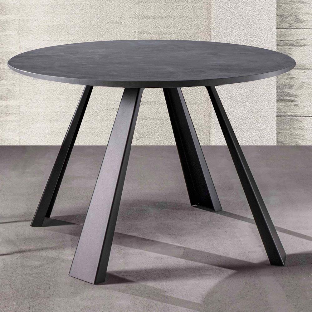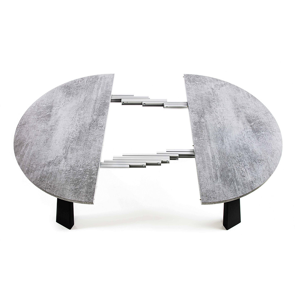 Mesa de comedor moderna con tapa redonda en madera de melamina (h 25 mm)   y patas en metal pintado de negro. La peculiaridad de este maravilloso artículo es la posibilidad de ampliarlo gracias a 2 ó 5 extensiones exteriores realizadas en el mismo acabado que la encimera que te permiten poder alojar a un mayor número de comensales sin problemas de espacio y al mismo tiempo asegurar una mesita que puede optimizar los espacios de tu hogar una vez cerrado. Este elemento aumenta su funcionalidad convirtiéndolo en la elección perfecta para aquellos a los que les encanta organizar comidas y cenas con amigos pero que también necesitan una solución no demasiado invasiva que, por tanto, pueda satisfacer todas las necesidades.