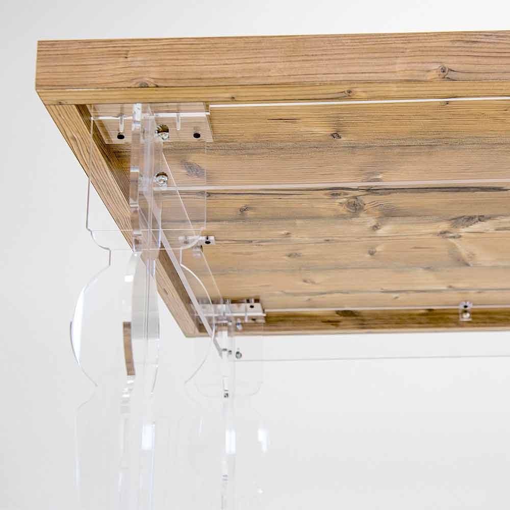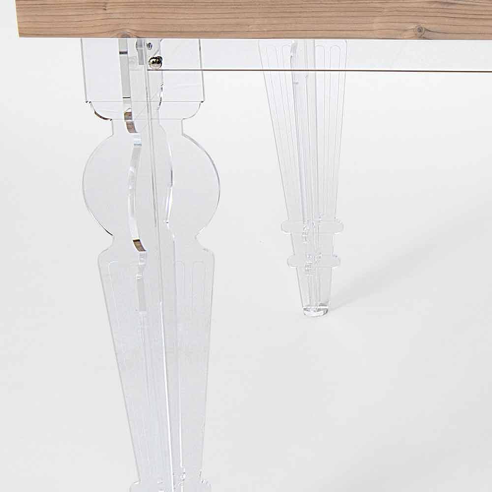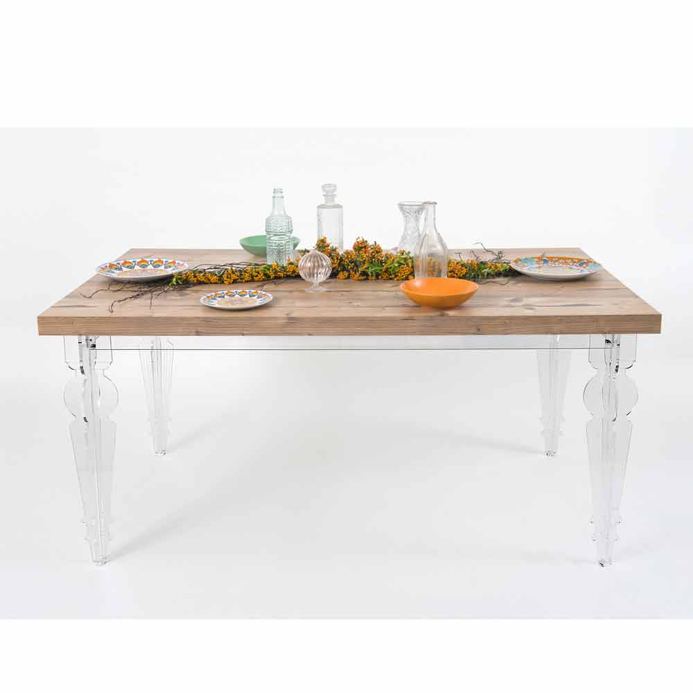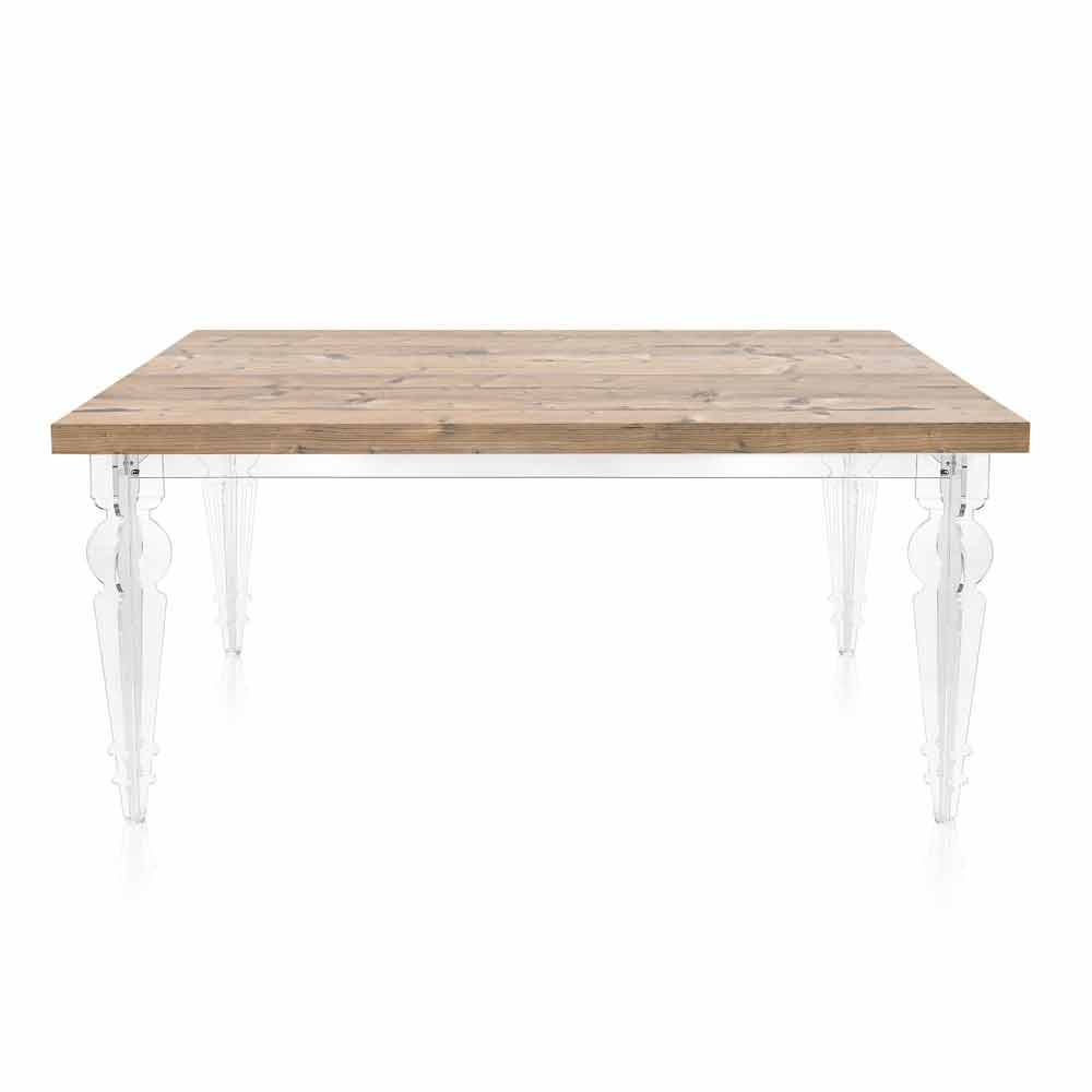 Mesa fija en madera de abeto y plexiglás hecha en Italia, Castro Castro es el resultado perfecto de la combinación de dos excelentes materiales: patas en cristal acrílico puro de PMMA y tapa en madera de abeto oscuro con un acabado mate natural cepillado.