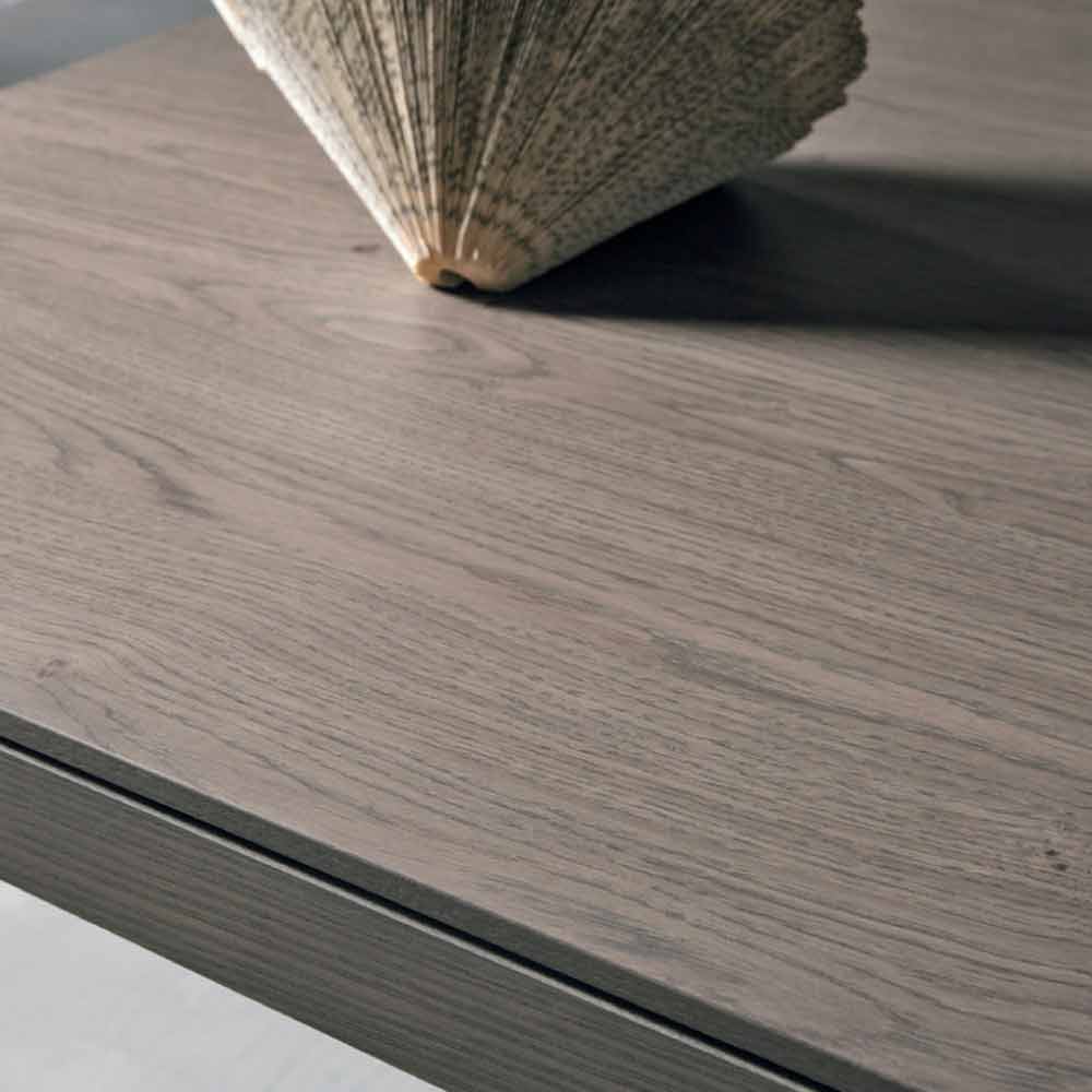 Dispone de una estructura de paneles inclinados (4 mm de espesor) en metal acabado microgofrado antracita ; En su interior se completa con una estructura de aluminio anodizado pintado que alberga tres extensiones de 45 cm cada una. La tapa está realizada en chapa de roble nudoso con perfil inclinado en dos caras, de 18+42mm de espesor y disponible en diferentes acabados: