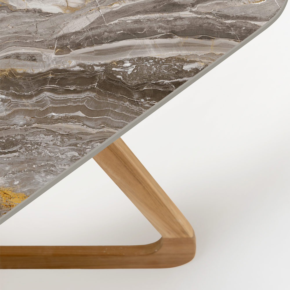 Made in Italy. Esta mesa de exterior es una maravilla de diseño que combina la solidez de la madera con la opulencia de la cerámica, inspirada en el mármol Orobico Luxe . Su tablero de cerámica, con sus tonos grises y brillantes vetas doradas, refleja la belleza y complejidad de las formaciones rocosas naturales, añadiendo un toque de lujo sofisticado a su espacio exterior.