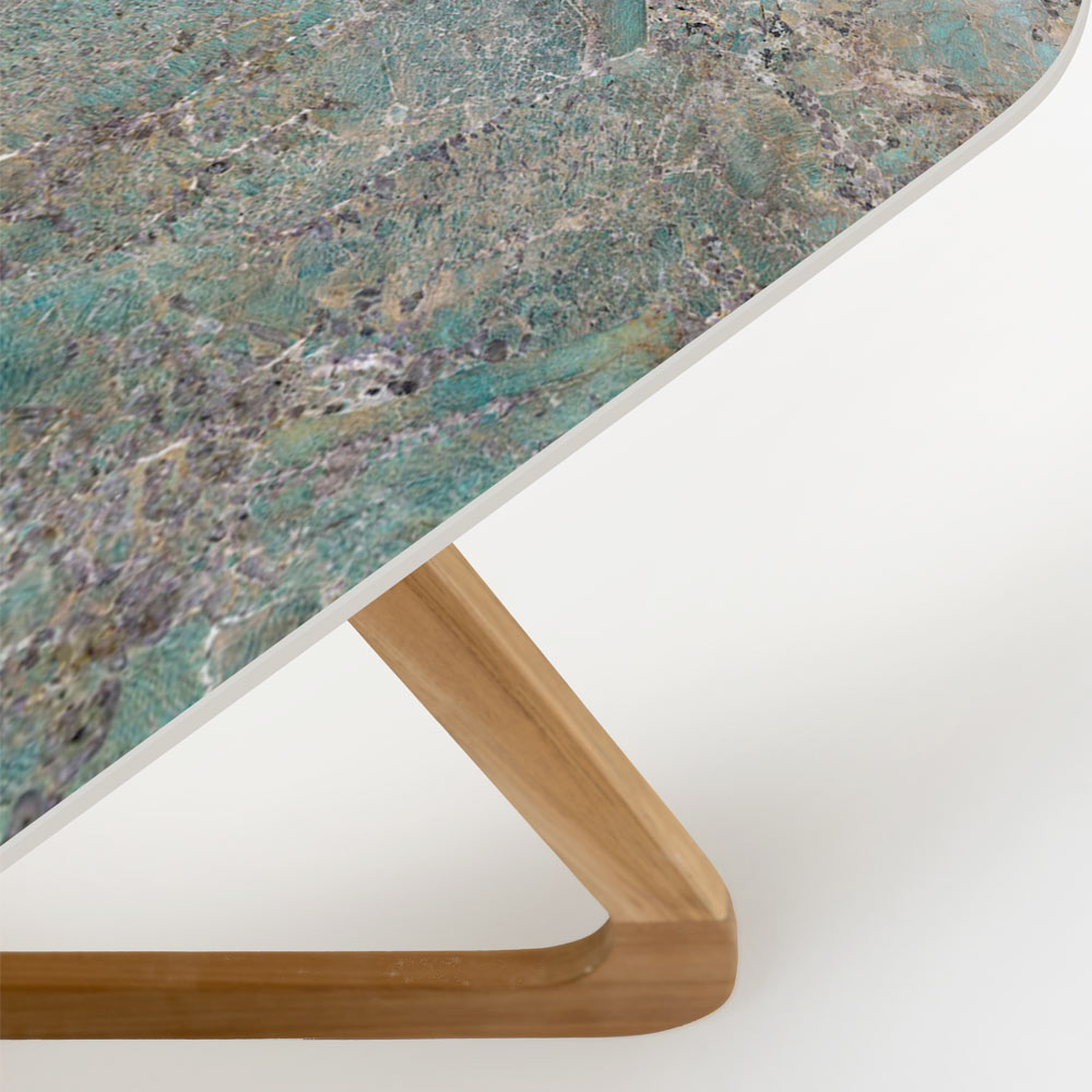 Mesa de exterior realizada con base de madera maciza de teca natural (35 mm de espesor), tablero cerámico infinity gres (12 mm de espesor) con acabado Santos brillante y subestructura en contrachapado marino Okumé , íntegramente Made in Italy.