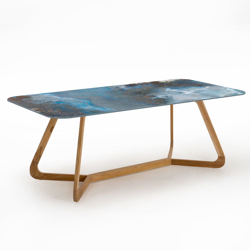 Made in Italy. Esta mesa de exterior es una fusión perfecta de elegancia natural y arte moderno. El tablero, elaborado con cerámica de alta calidad, presenta un acabado único que imita las texturas orgánicas y los vibrantes colores de una formación rocosa, con tonos azules, grises y toques cobrizos. Esta superficie no solo es llamativa, sino también extremadamente duradera, ideal para el uso diario en exteriores.