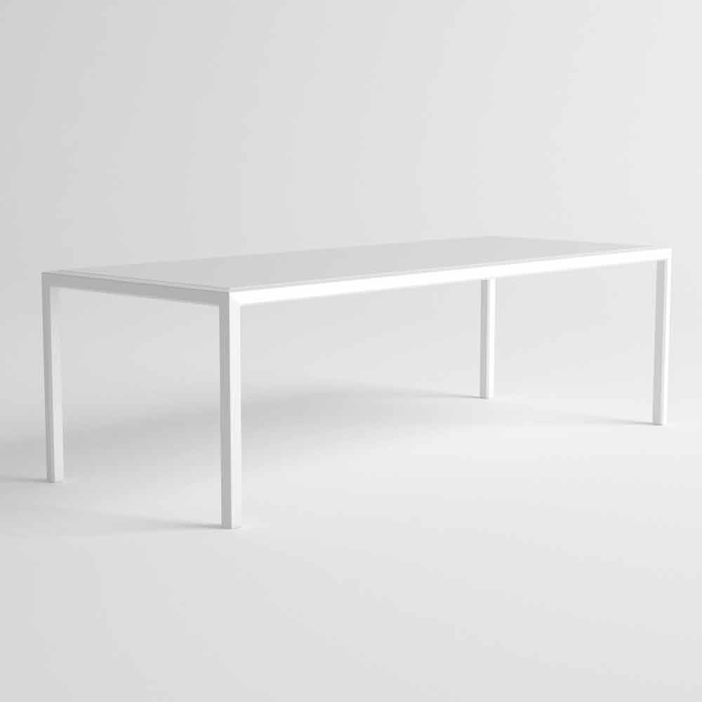 La mesa de comedor tiene líneassimples y esenciales, con una estructura de aluminio y la parte superior laminada de HPL, un material decorativo que consiste en numerosas capas de papel Kraft impregnado con resinas termoendurecibles y compactado con papel decorativo y revestimiento protector mediante la acción combinada de calor y alta presión. . Estos dos materiales son excelentes porque duran con el tiempo, son fáciles de mantener y versátiles.