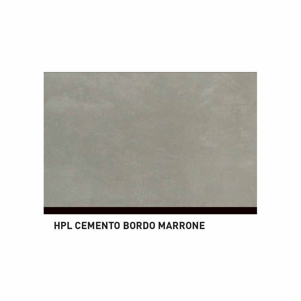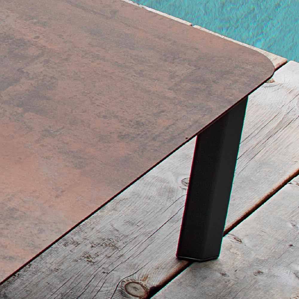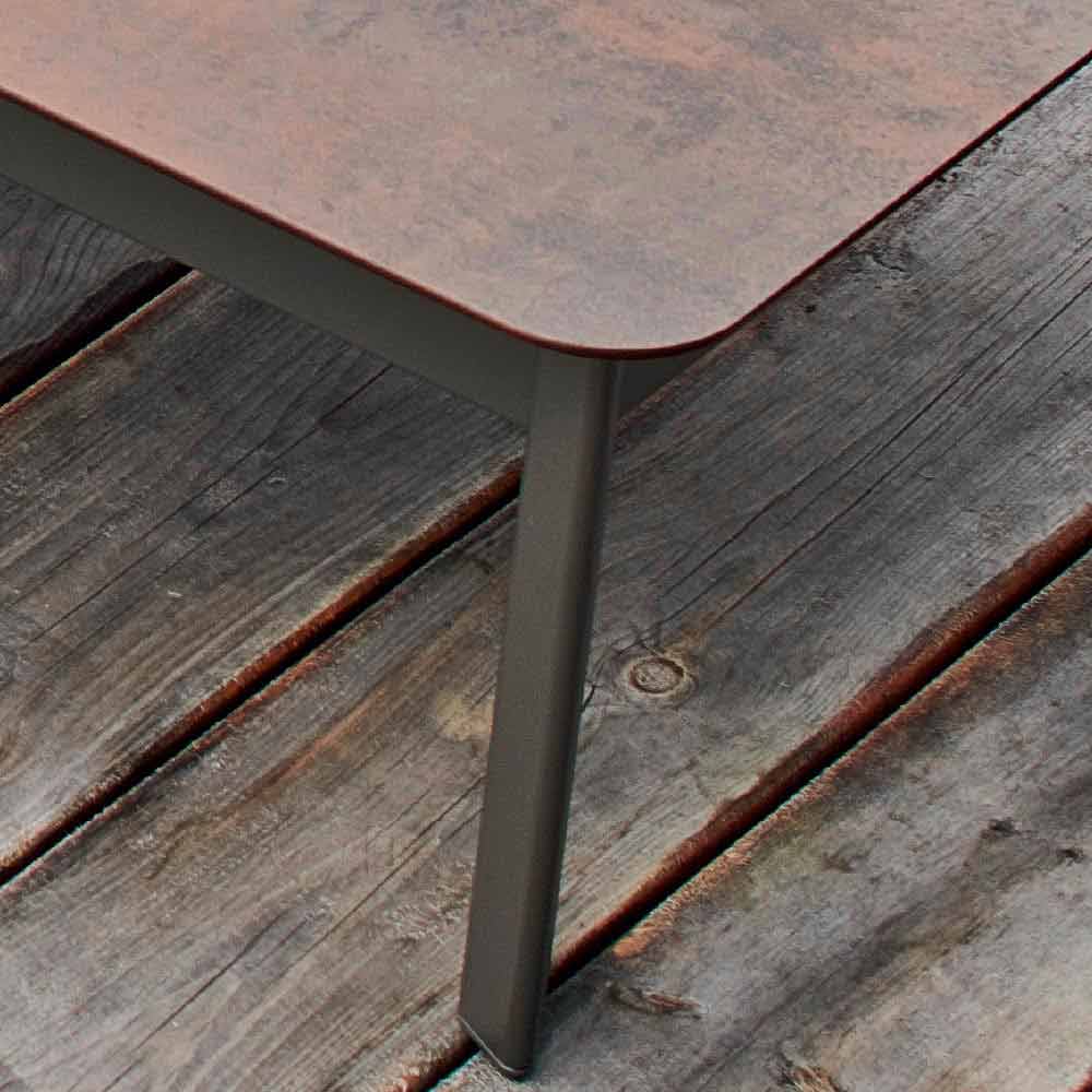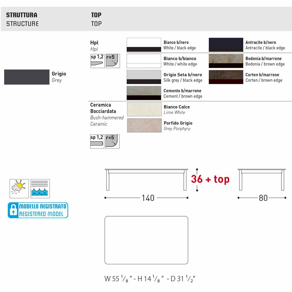 El sistema es una mesa de jardín elegante con una estructura de aluminio con recubrimiento de polvo gris ; con tapa en HPL (sp 1.2) en acabado: borde negro gris seda, borde negro blanco, borde negro antracita, borde blanco blanco, borde marrón cemento, borde marrón bedonia, borde marrón corten ; o con una tapa de cerámica martillada (sp 1.2) en el acabado: cal blanca y pórfido gris .