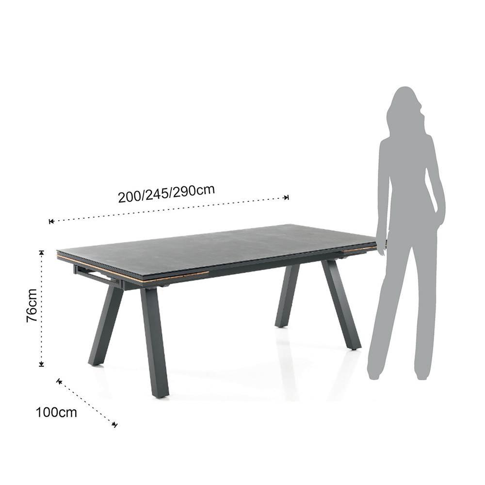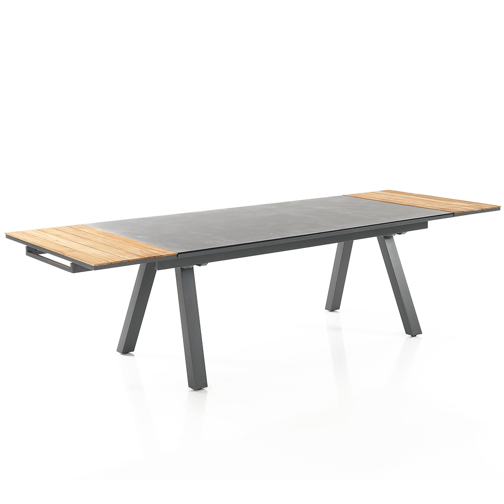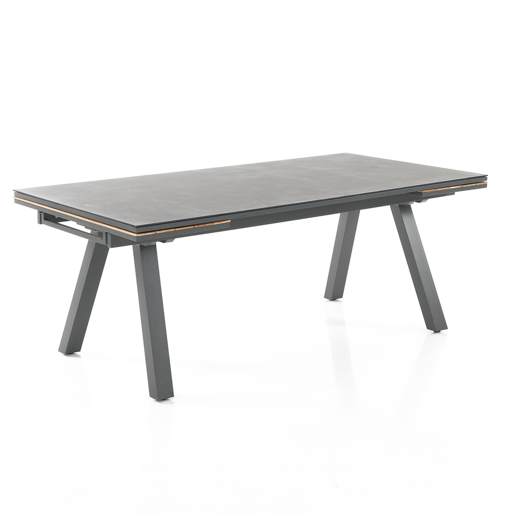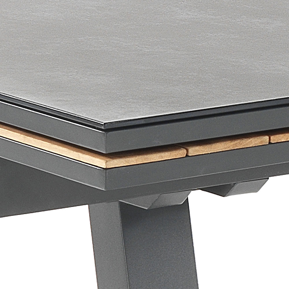 Esta mesa de jardín extensible es una auténtica expresión de versatilidad y estilo . El diseño moderno y las líneas limpias se combinan con la elegancia de las extensiones de teca, creando un sugerente contraste visual que realza la belleza de los ambientes exteriores contemporáneos . La robusta construcción de aluminio le da a esta mesa una estabilidad impecable y durabilidad a largo plazo .