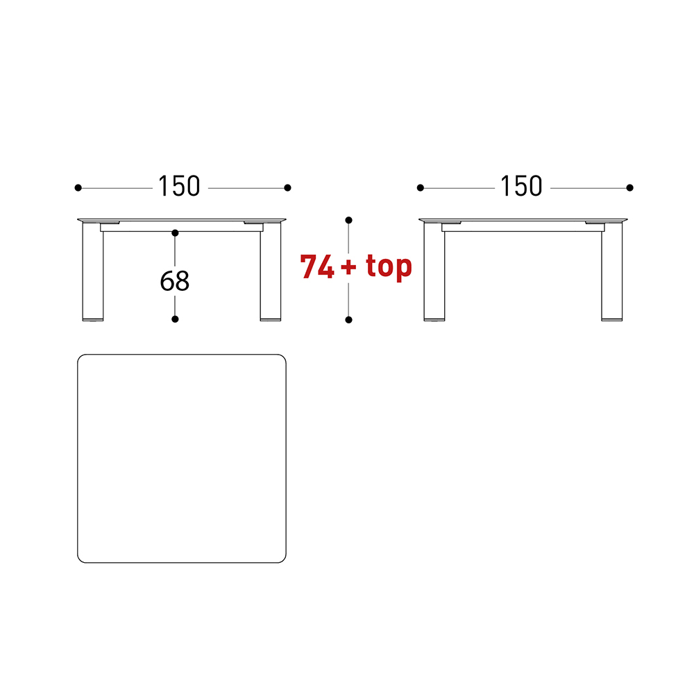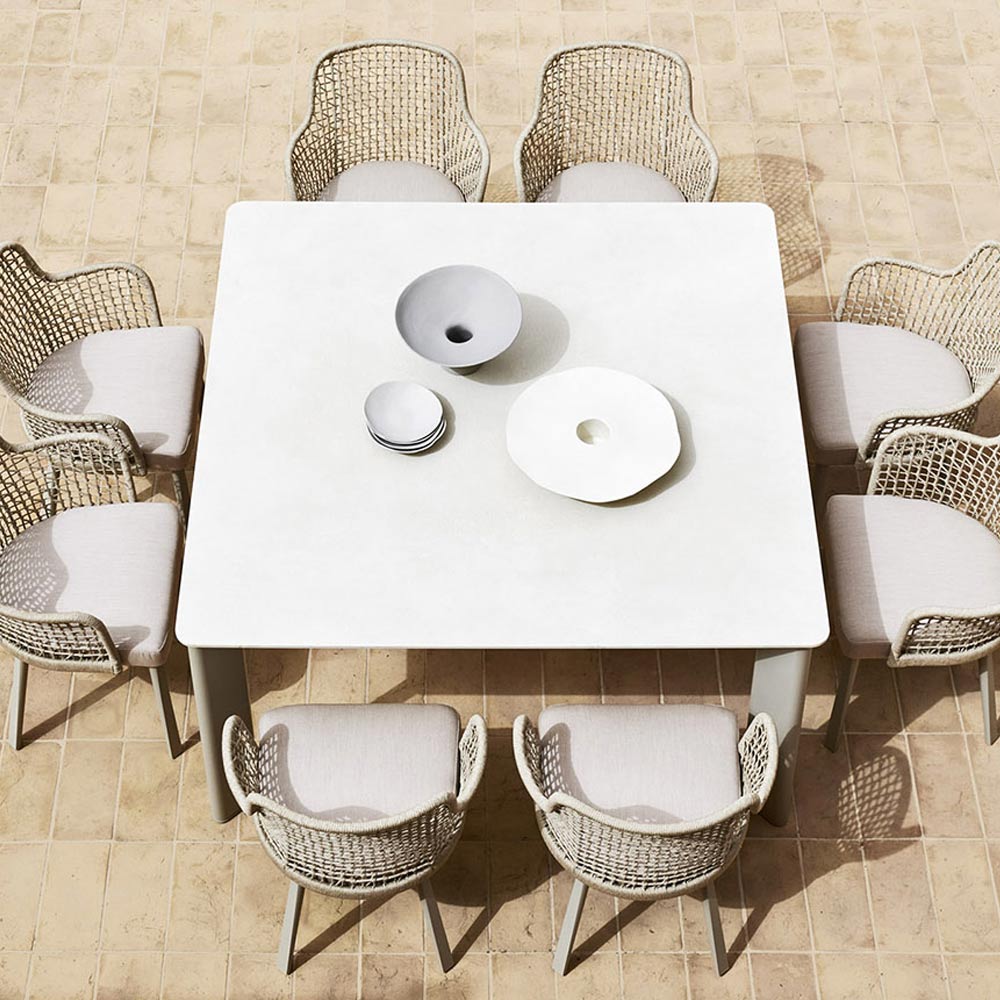 Mesa de comedor para exterior completamente fabricada en Italia con forma cuadrada con estructura en aluminio pintado en polvo y tapa en hplo cerámica abujardada, disponible en dos tamaños diferentes .Gracias a su estilo esencial, versátil y moderno, esta mesa es perfecta para completar el mobiliario de diferentes zonas de estar, tanto interiores como exteriores, enriqueciendo la estética del ambiente con un toque de personalidad.