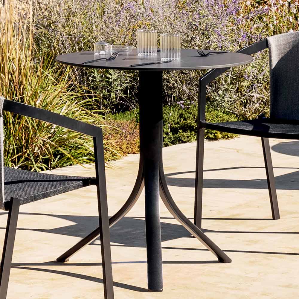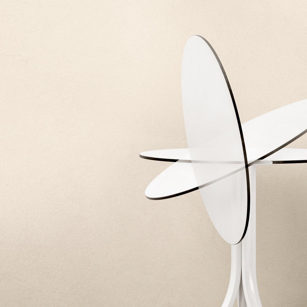 Características técnicas y materiales: La potencia plegable de tres radios está hecha de aluminio con recubrimiento de polvo epoxi , combinado con la parte superior redonda en laminado HPL de 10 mm de espesor.