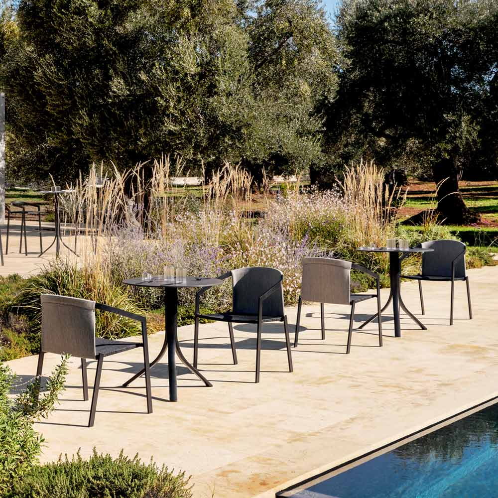 La colección se caracteriza por el detalle de la pata de aluminio como punto focal combinado con el rigor formal, para vivir el aire libre en términos de máxima relajación y convivencia, sentado en el sofá, alrededor de una mesa o tumbado en la tumbona.
