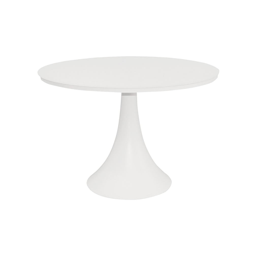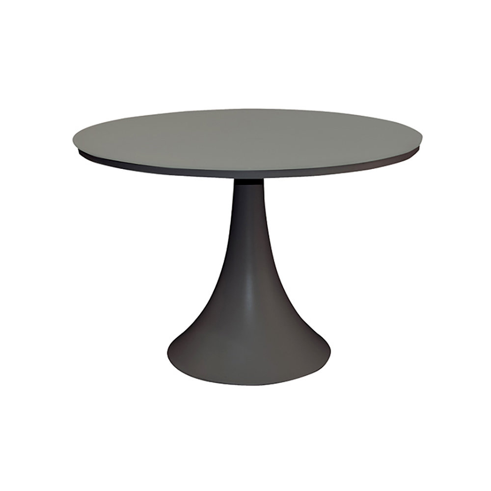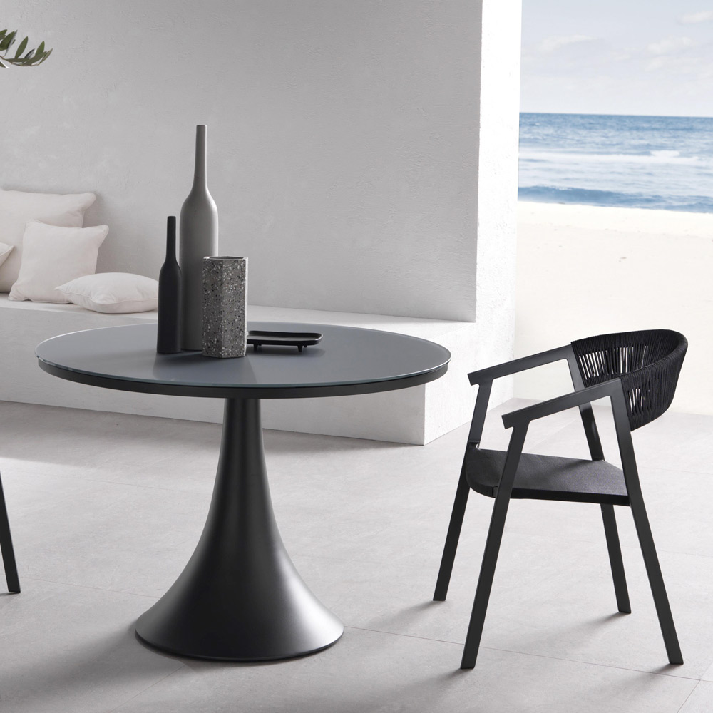 Mesa de jardín redonda fabricada en aluminio pintado con polvos epoxi y tapa trasera de cristal pintado .Las dulces formas de esta mesa se adaptan a la perfección a cualquier tipo de ambiente exterior, aportándole un marcado carácter moderno y personal . Sus materiales de calidad están hechos para ser resistentes y duraderos.