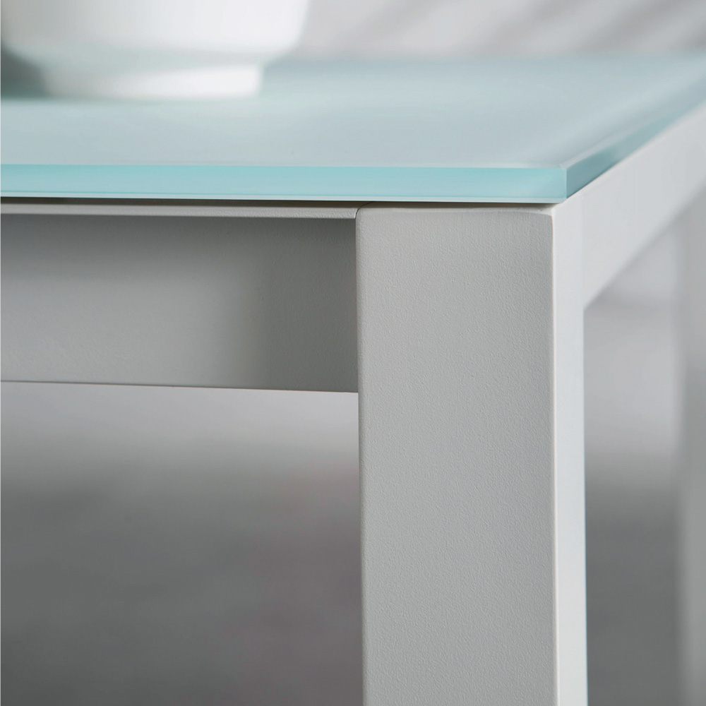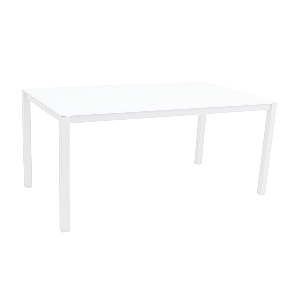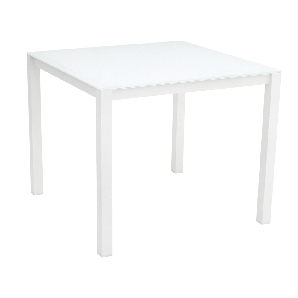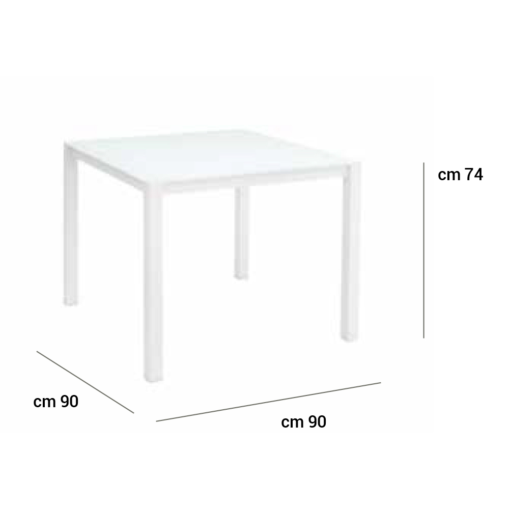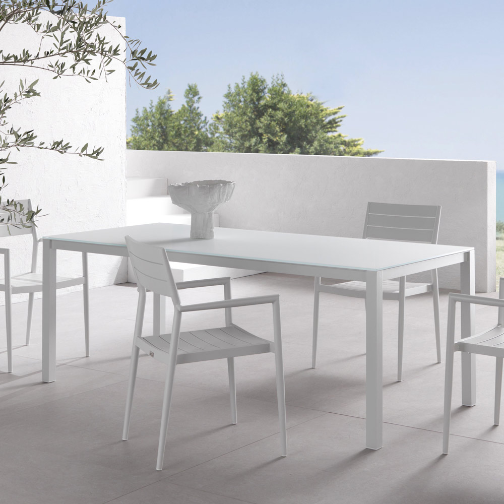 Mesa de comedor de jardín fabricada en aluminio pintado con polvos epoxi y tapa de cristal retropintado.Esta mesa se caracteriza por sus marcadas formas cuadradas que consiguen encajar en cualquier tipo de ambiente exterior contemporáneo, aportándole un marcado carácter moderno y personal . Sus materiales de calidad están hechos para ser resistentes y duraderos.