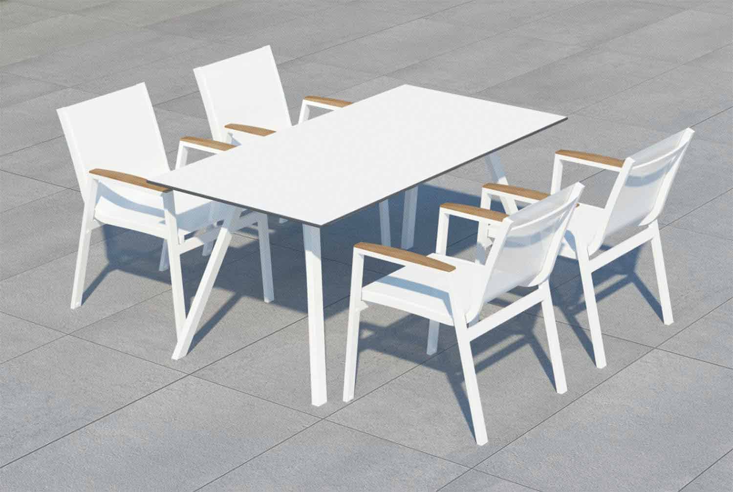 Mesa de jardín de diseño moderno, estructura en aluminio y laminado HPL, disponible en diferentes colores y tamaños.