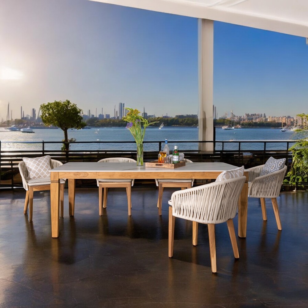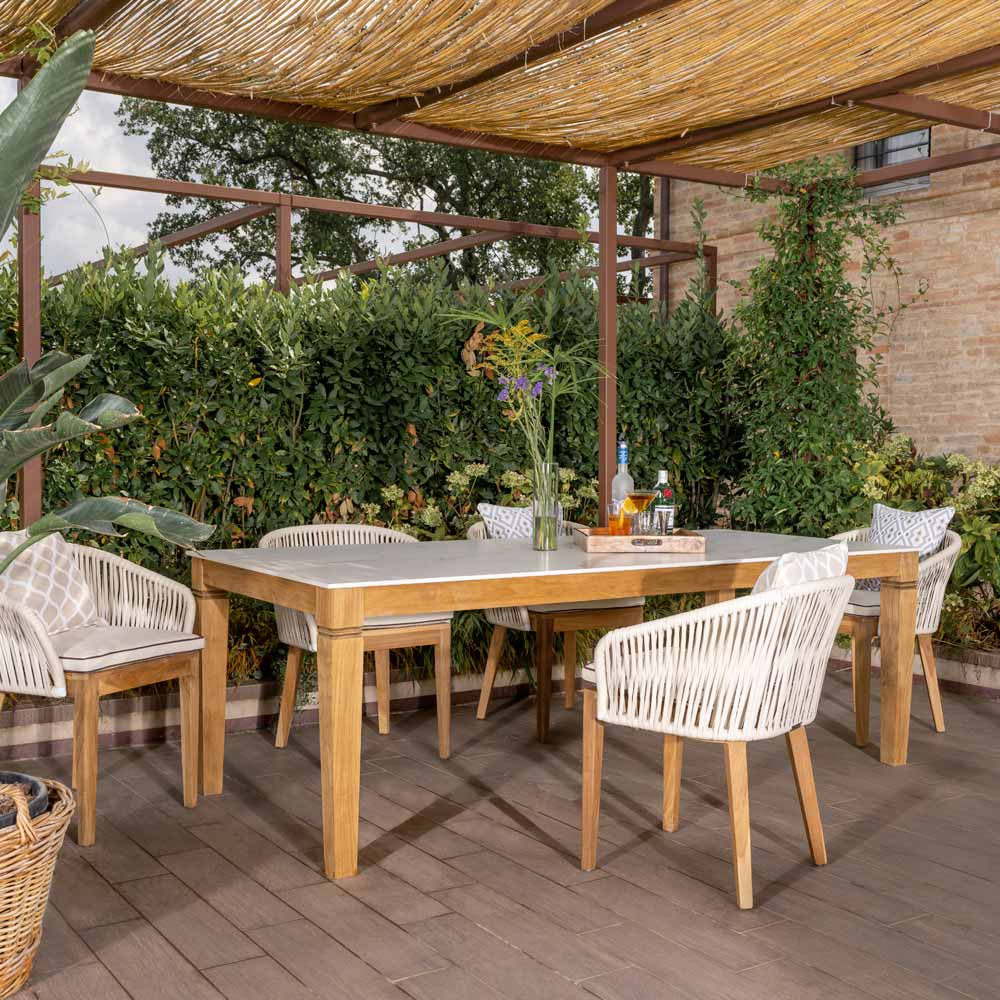 Esta mesa es perfecta para ser colocada en espacios de exterior resguardados y para acoger cómodamente a tus invitados en momentos de convivencia.