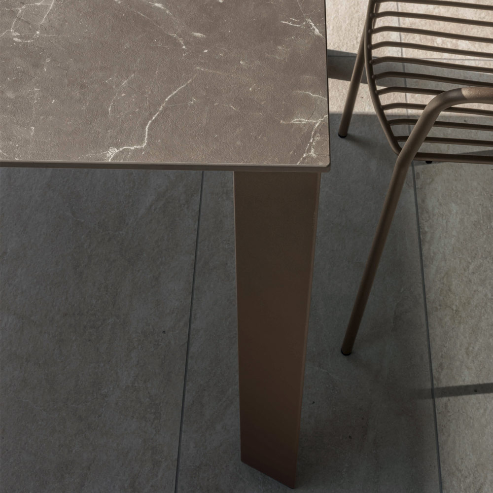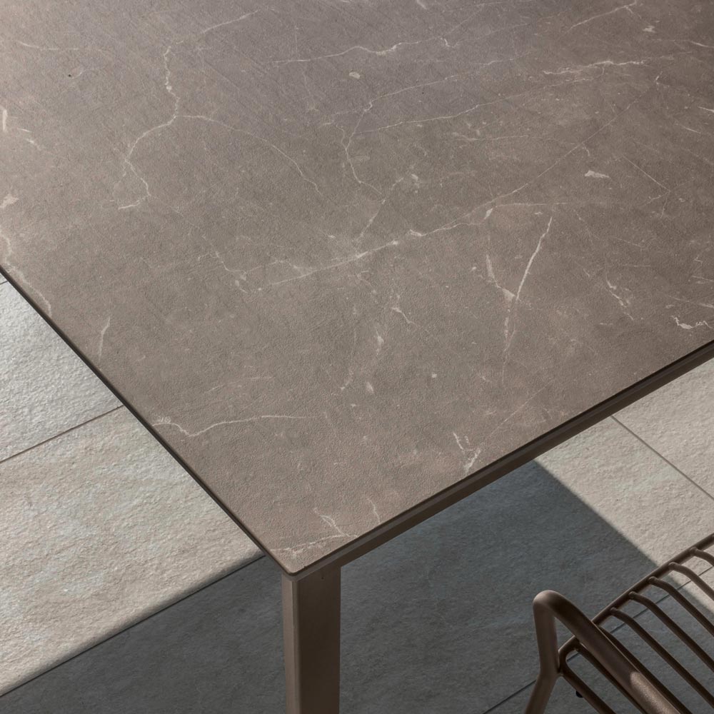 Mesa de jardíncon estructura de metal pintado bronce gofrado y tapa rectangular de hpl . Un mueble hecho a mano en Italia con materiales de alto rendimiento resistentes a los agentes atmosféricos que aseguran un resultado funcional y duradero junto con una estética contemporánea , elegante y refinada .