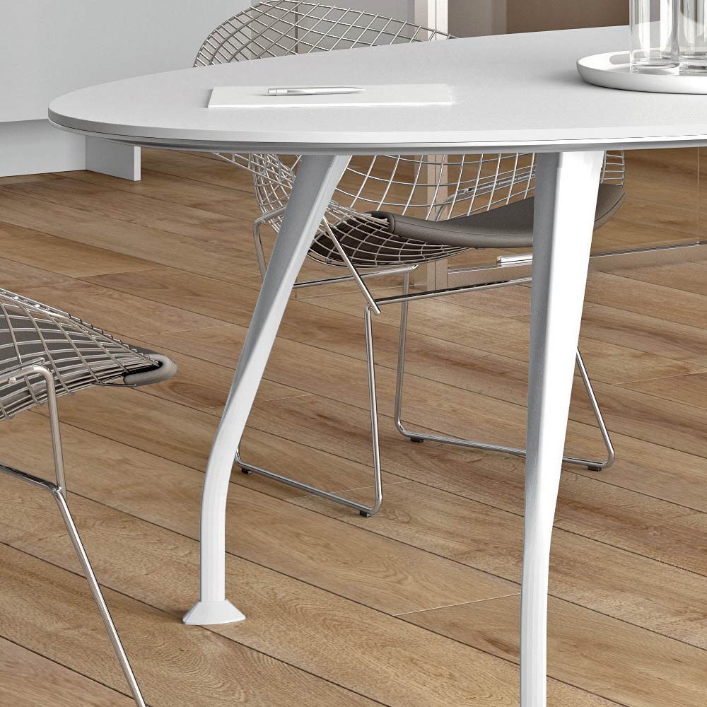 Esta mesa se compone de un sobre ovalado de melamina en el acabado blanco y 4 patas Infinity, también en el acabado blanco mate.