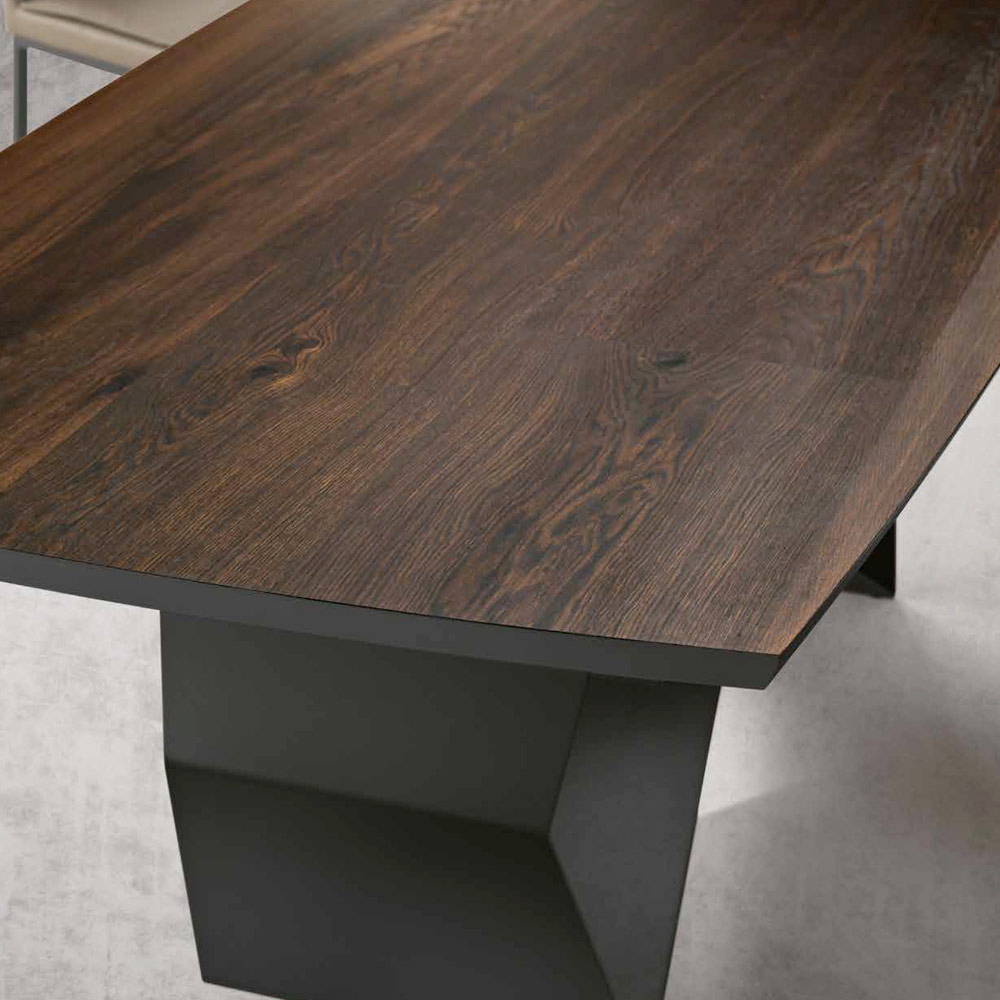Esta mesa de comedor es perfecta para cualquier espacio habitable moderno. El tablero de la mesa, fabricado con fina chapa de roble, no sólo aporta una calidez orgánica al ambiente, sino que también es conocido por su resistencia y durabilidad, lo que la hace ideal para el uso diario.