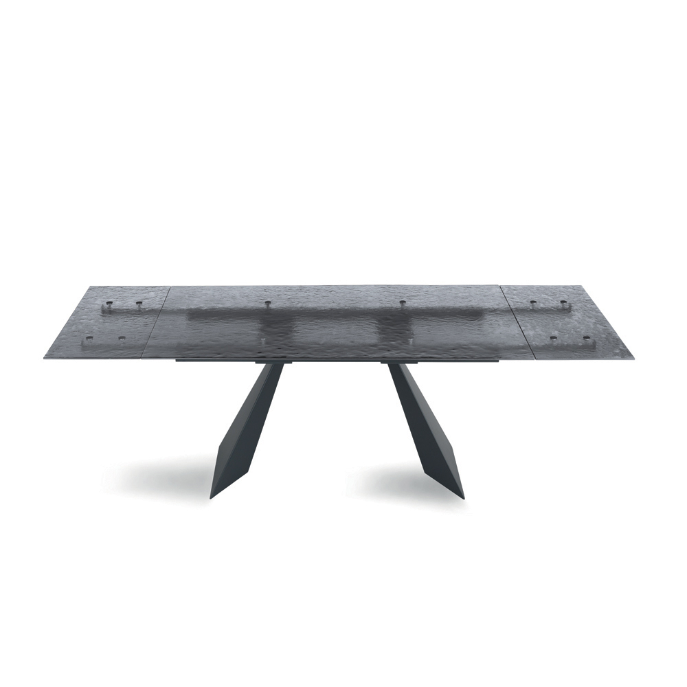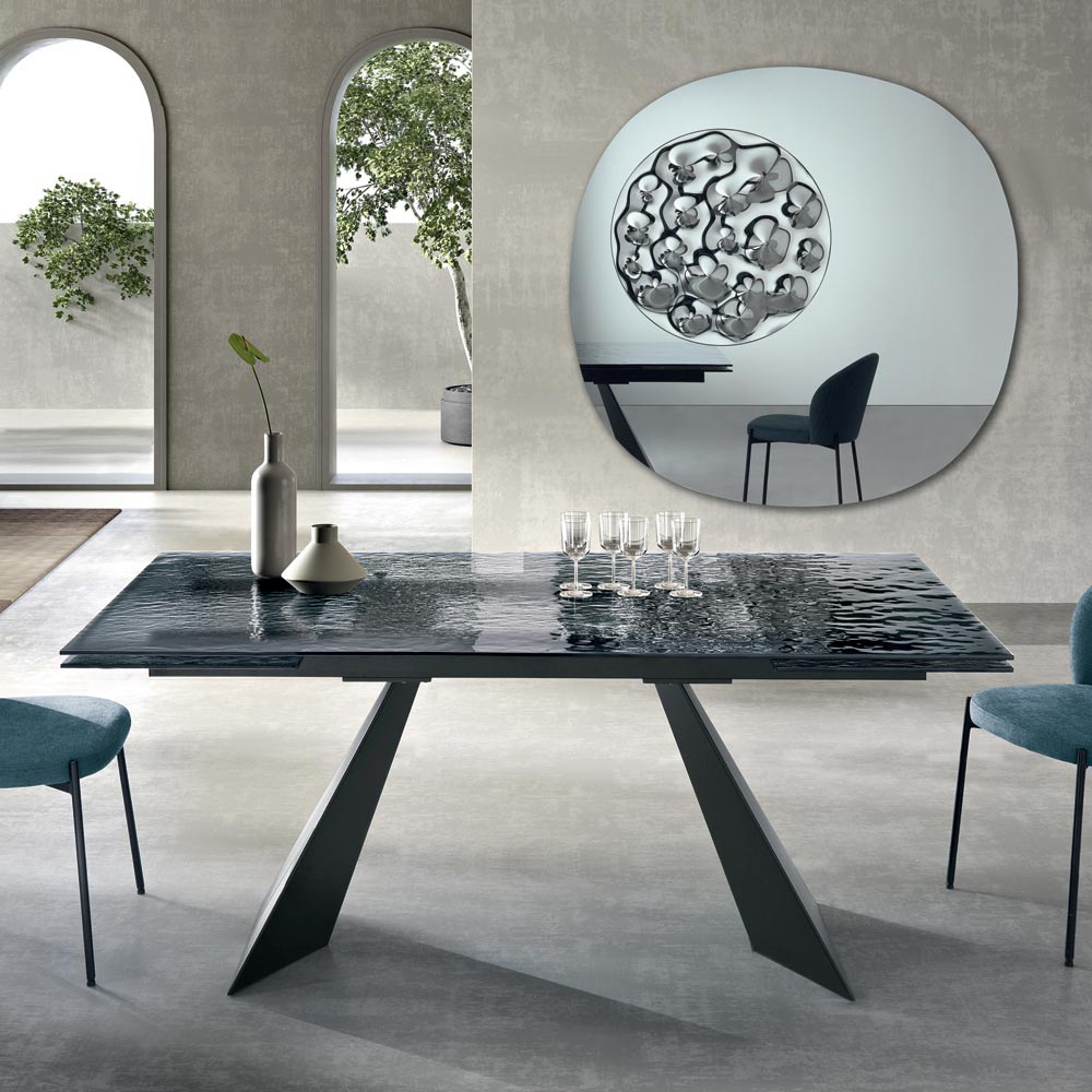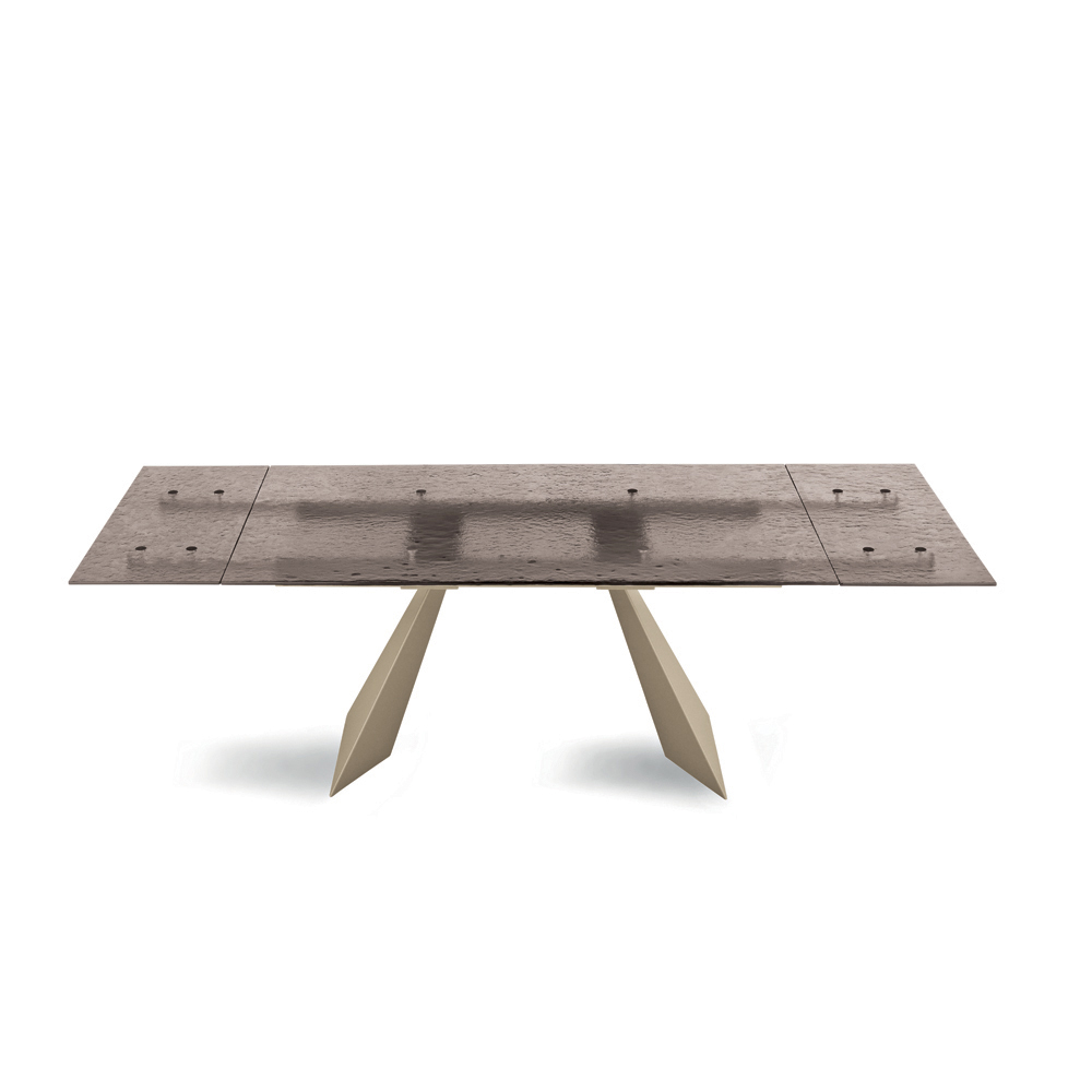 Esta mesa de comedor representa una interpretación innovadora del diseño moderno, combinando materiales de alta calidad con una forma escultural que cautiva la mirada. El tablero, de vidrio martillado , es una verdadera obra de arte: cada detalle de su superficie refleja la luz de una manera única, creando un juego de reflejos y transparencias que aporta profundidad e interés visual al espacio.