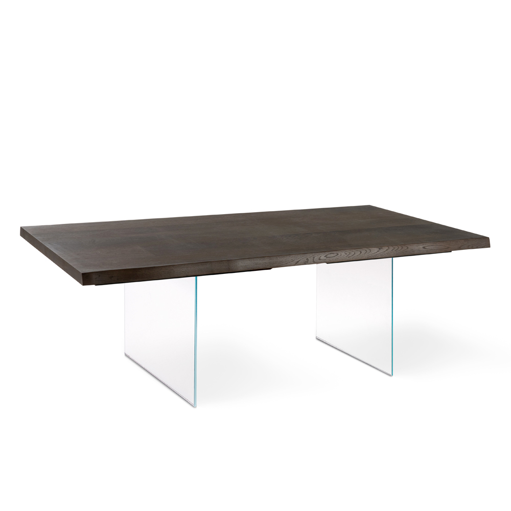 Mesa de salón fija con tapa chapada en roble , patas de cristal templado extra transparente.