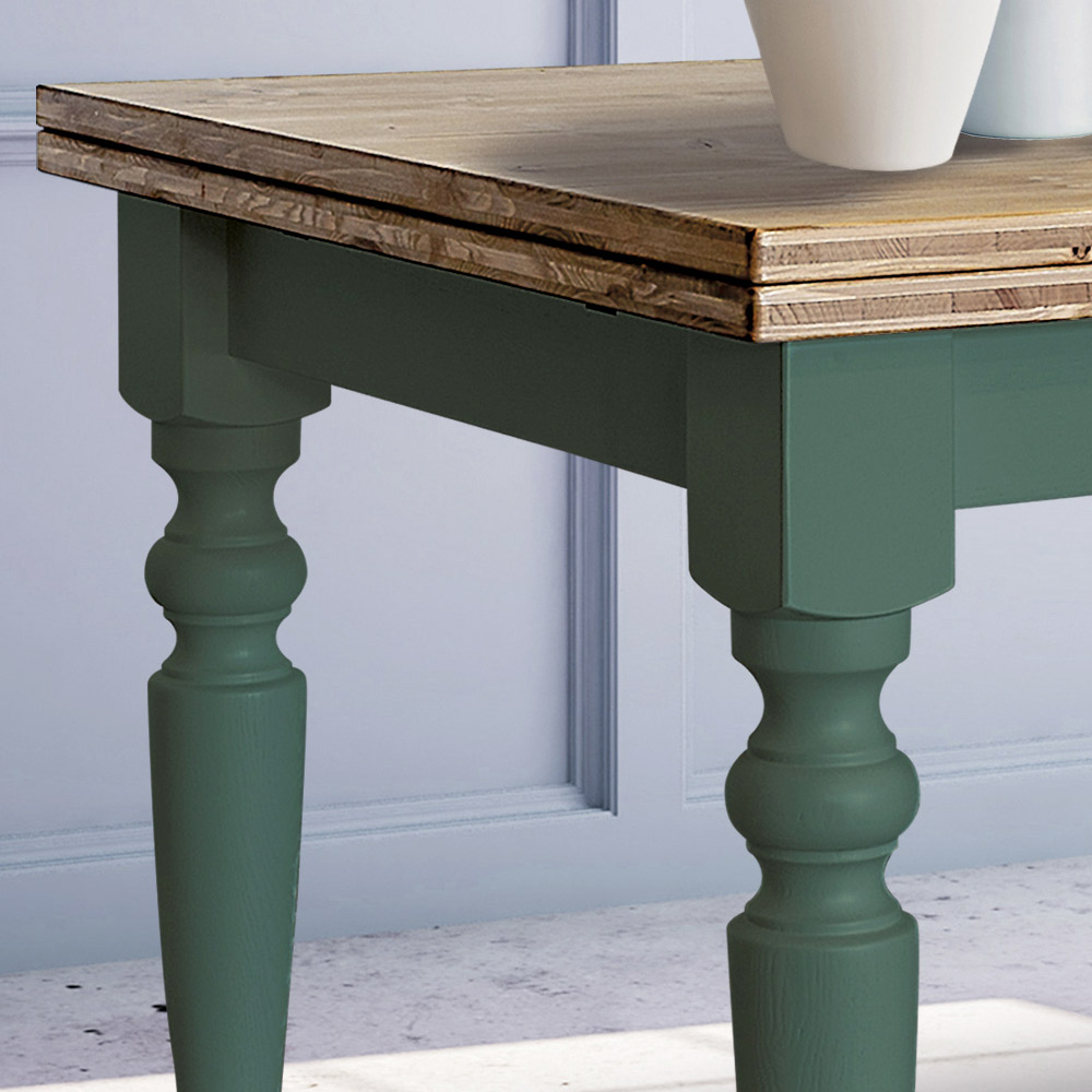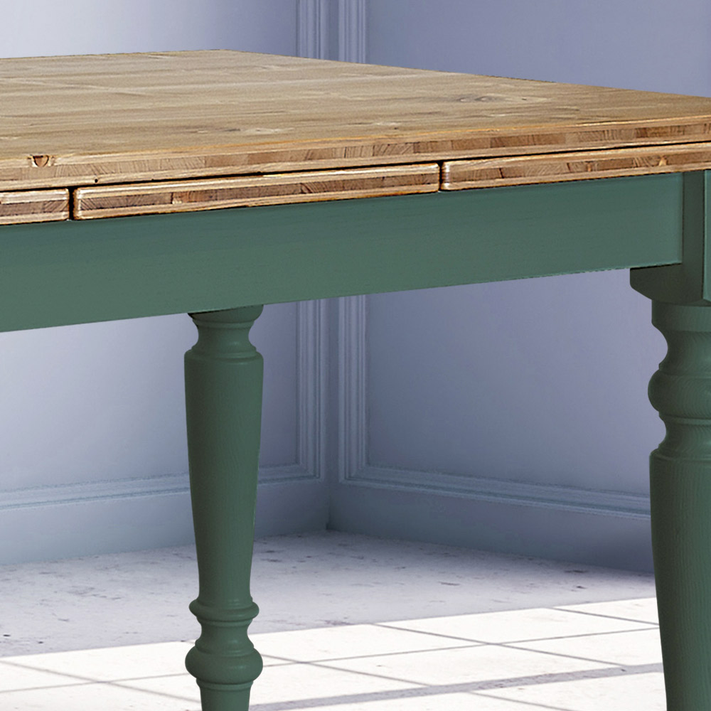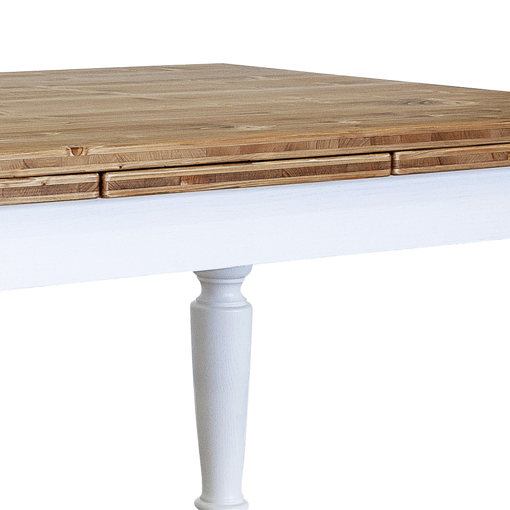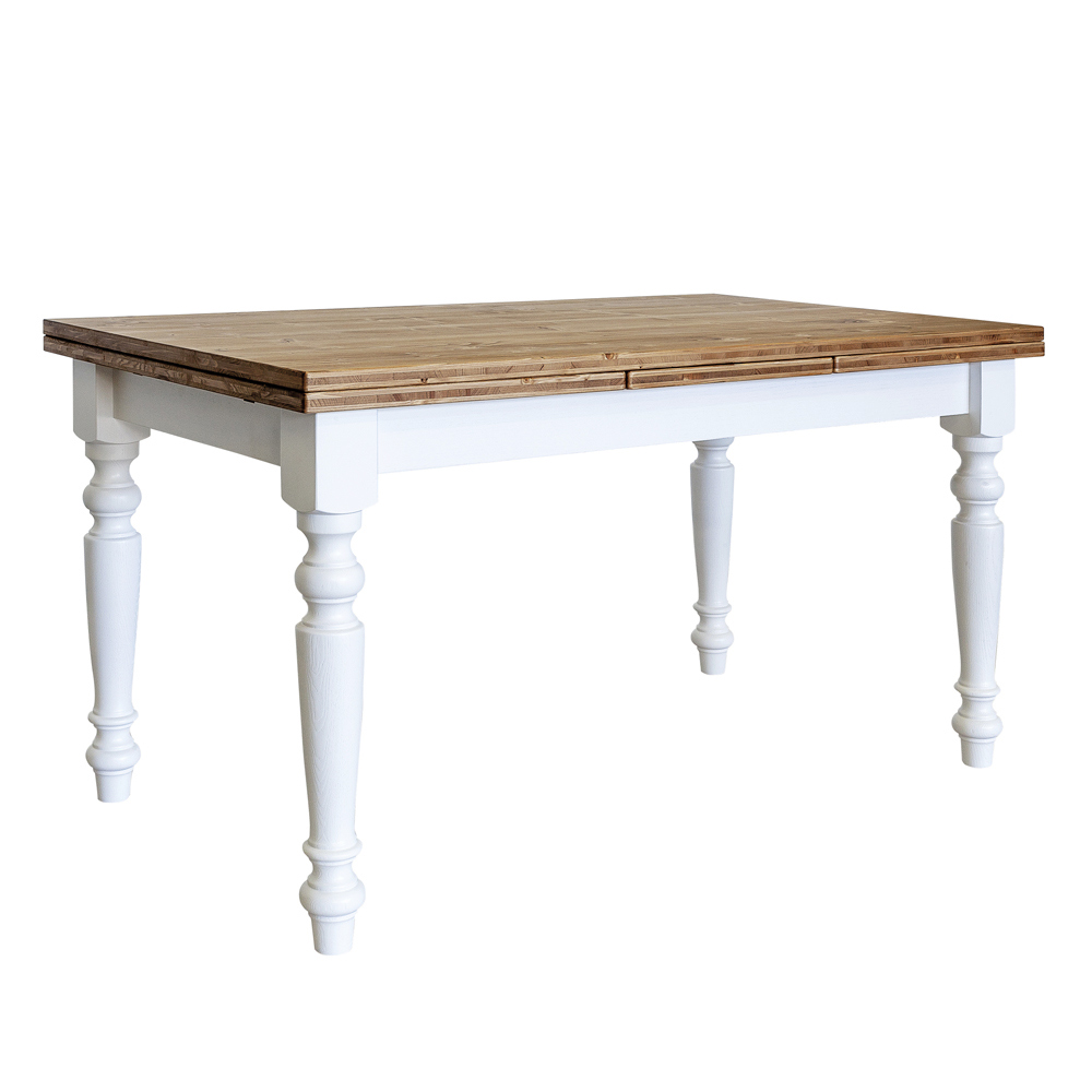 Mesa de salón extensible en abeto nórdico anudado. Las patas están torneadas en madera maciza y conectadas entre sí por una banda de madera maciza . El producto está íntegramente realizado en la Toscana con el uso de materiales de alta calidad y viene con 2 extensiones de 50 cm cada una que lo hacen versátil .