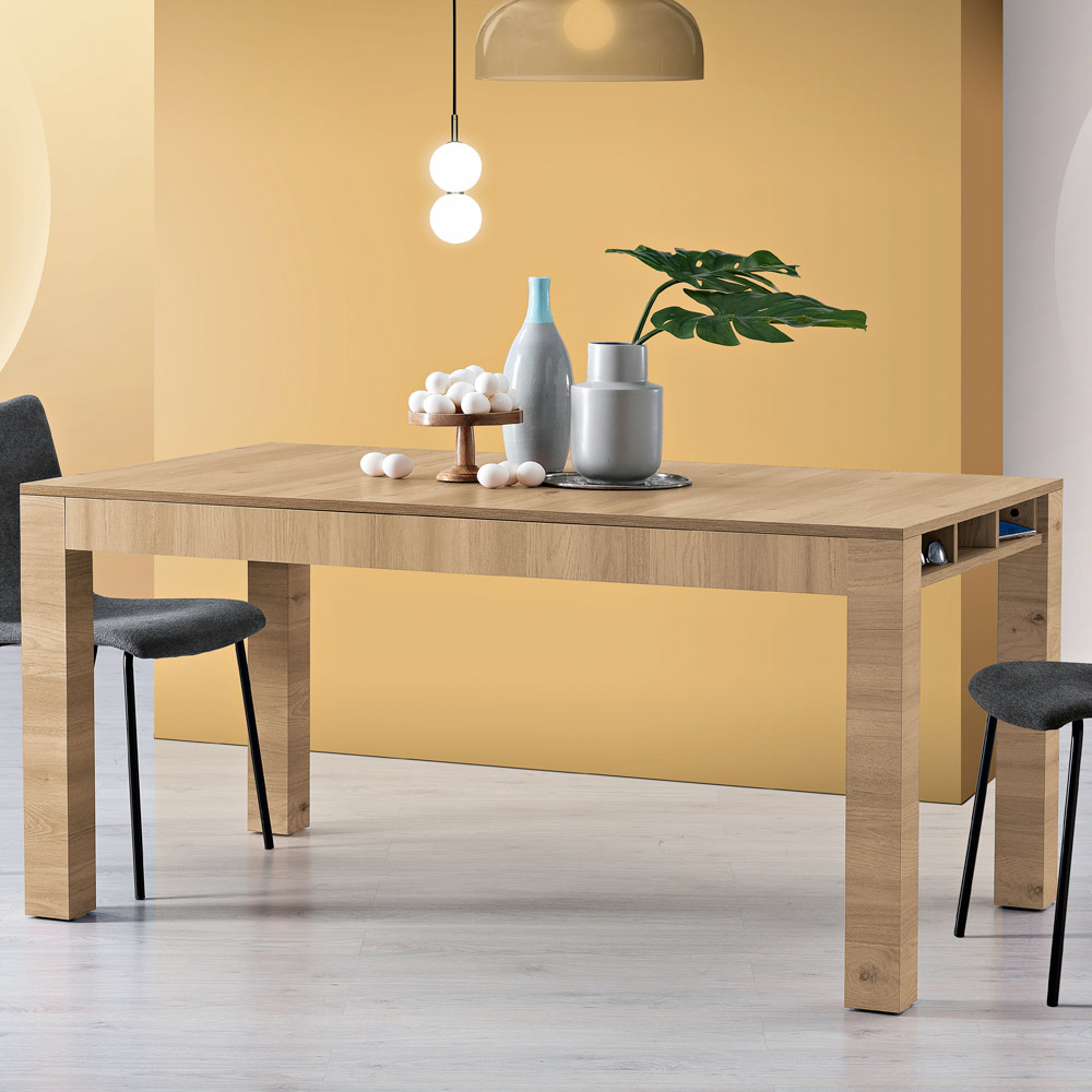 La calidez natural de la madera se une al ingenio del diseño contemporáneo en esta mesa extensible . Los acabados no solo son hermosos a la vista, sino que también ofrecen una superficie duradera y resistente al uso diario, perfecta para albergar desde sencillos desayunos matutinos hasta refinadas cenas con amigos.