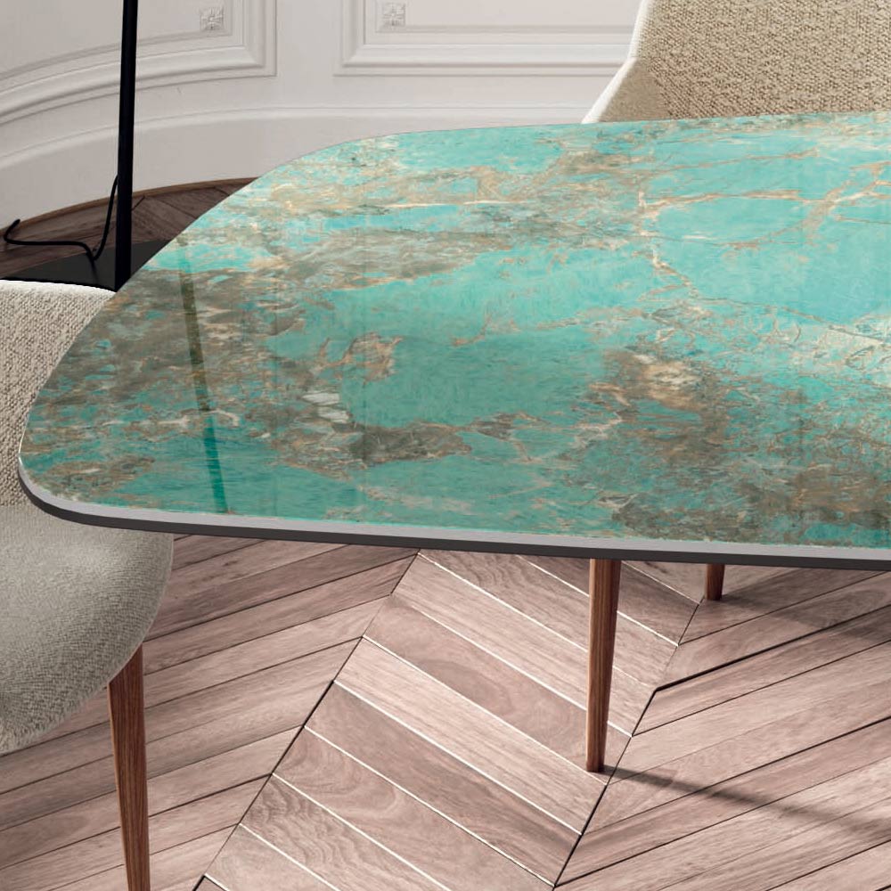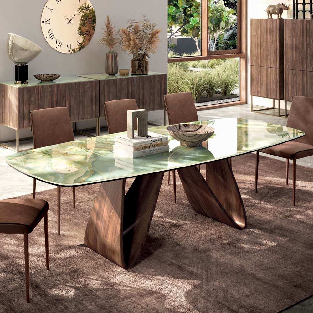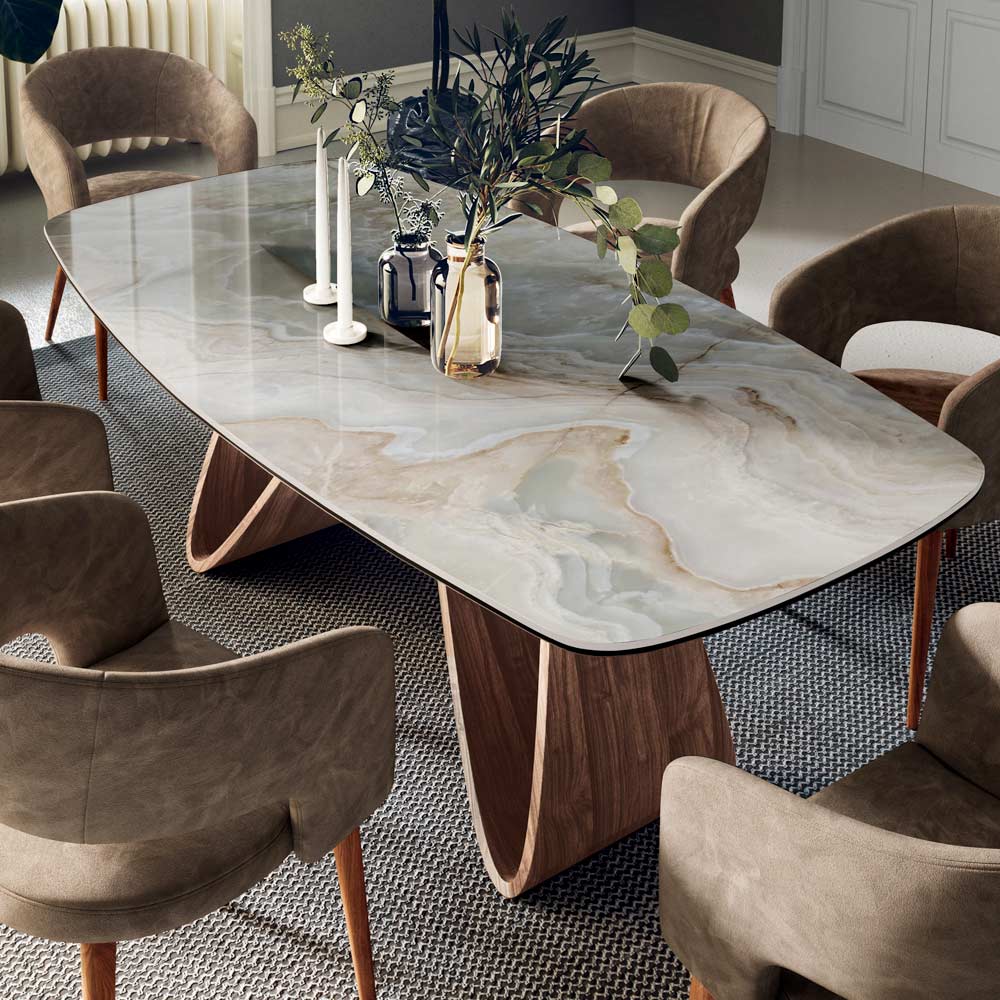 Mesa de salón fija en forma de barril con tapa de cerámica , biselado a 45° , base de madera chapada en nogal Canaletto y pies regulables. Gracias a la forma de la base y a los acabados de la tapa disponibles, la mesa es capaz de dar un toque de movimiento y elegancia a cualquier ambiente diario y contract. Los materiales garantizan funcionalidad y practicidad para tener un producto no sólo visualmente muy bonito sino también utilizable en cualquier ocasión.