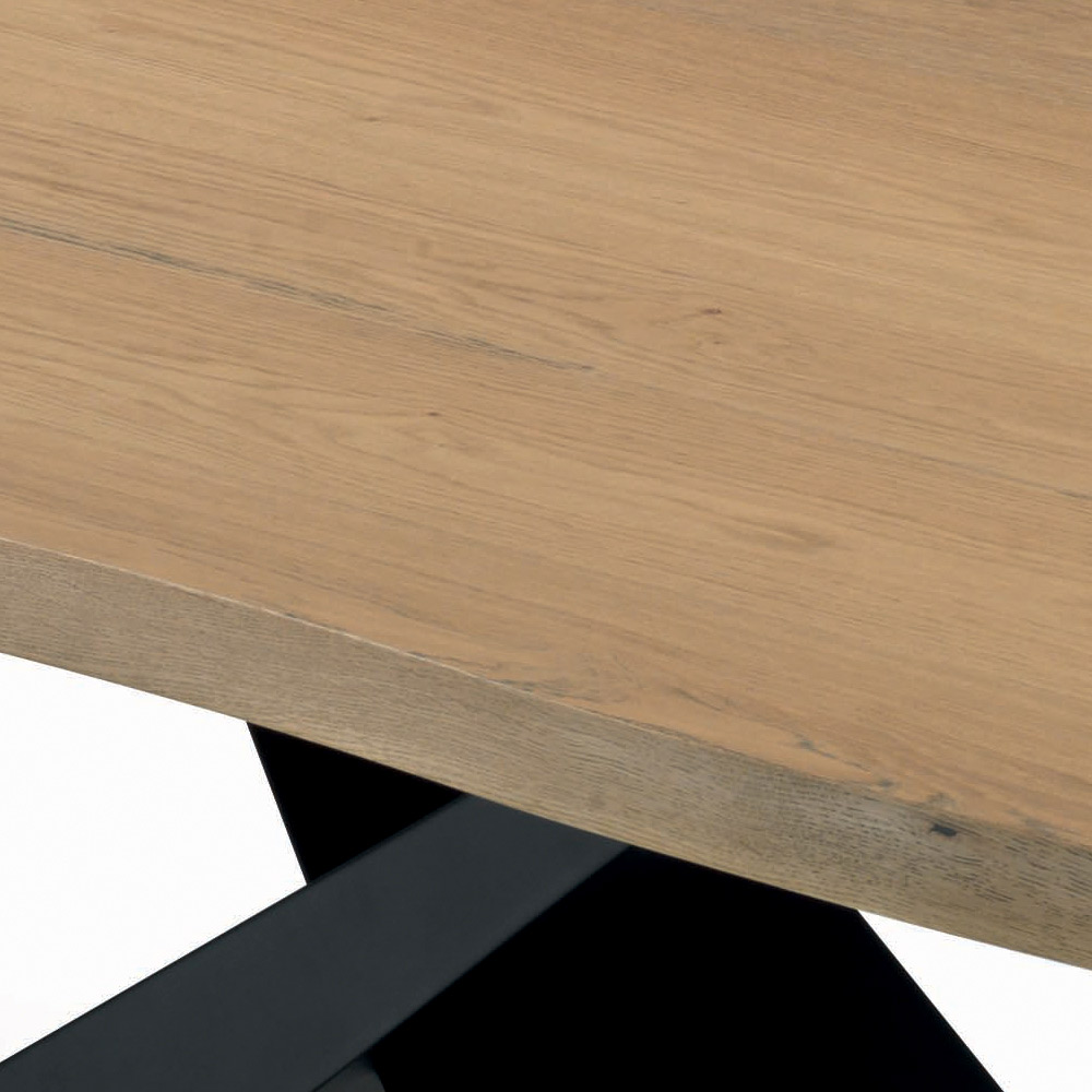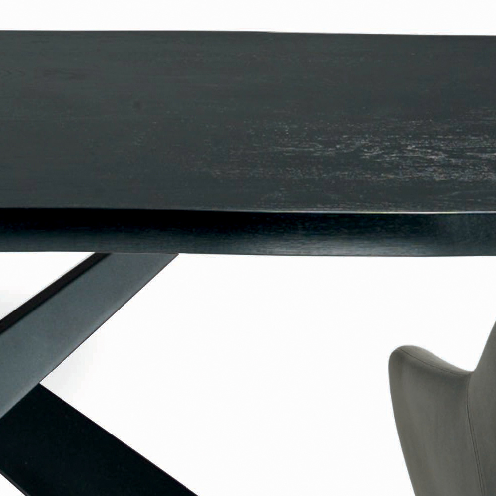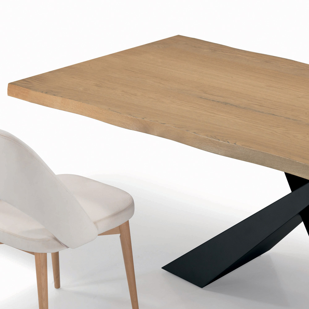 Mesa de salón fija con tapa de madera chapada , canto descortezado irregular , base de acero lacado en negro y pies regulables. La inusual forma de X de la base confiere a la mesa un toque único y refinado adecuado para personalizar y completar el mobiliario de cualquier ambiente cotidiano y contract.Materiales de excelente calidad y precisión en la fabricación son las cualidades de esta mesa que garantiza toda la funcionalidad del Made in Italy.