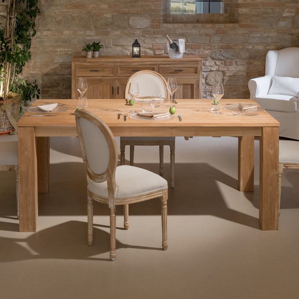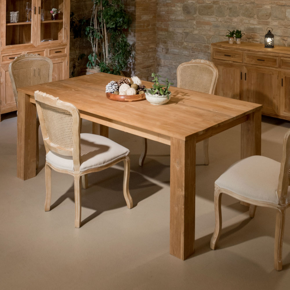 Esta mesa fija de teca maciza es una pieza robusta y elegante, ideal para añadir estilo a su comedor o cocina. Su robusta estructura y su artesanía realzan la veta natural de la madera , creando un ambiente cálido y acogedor.