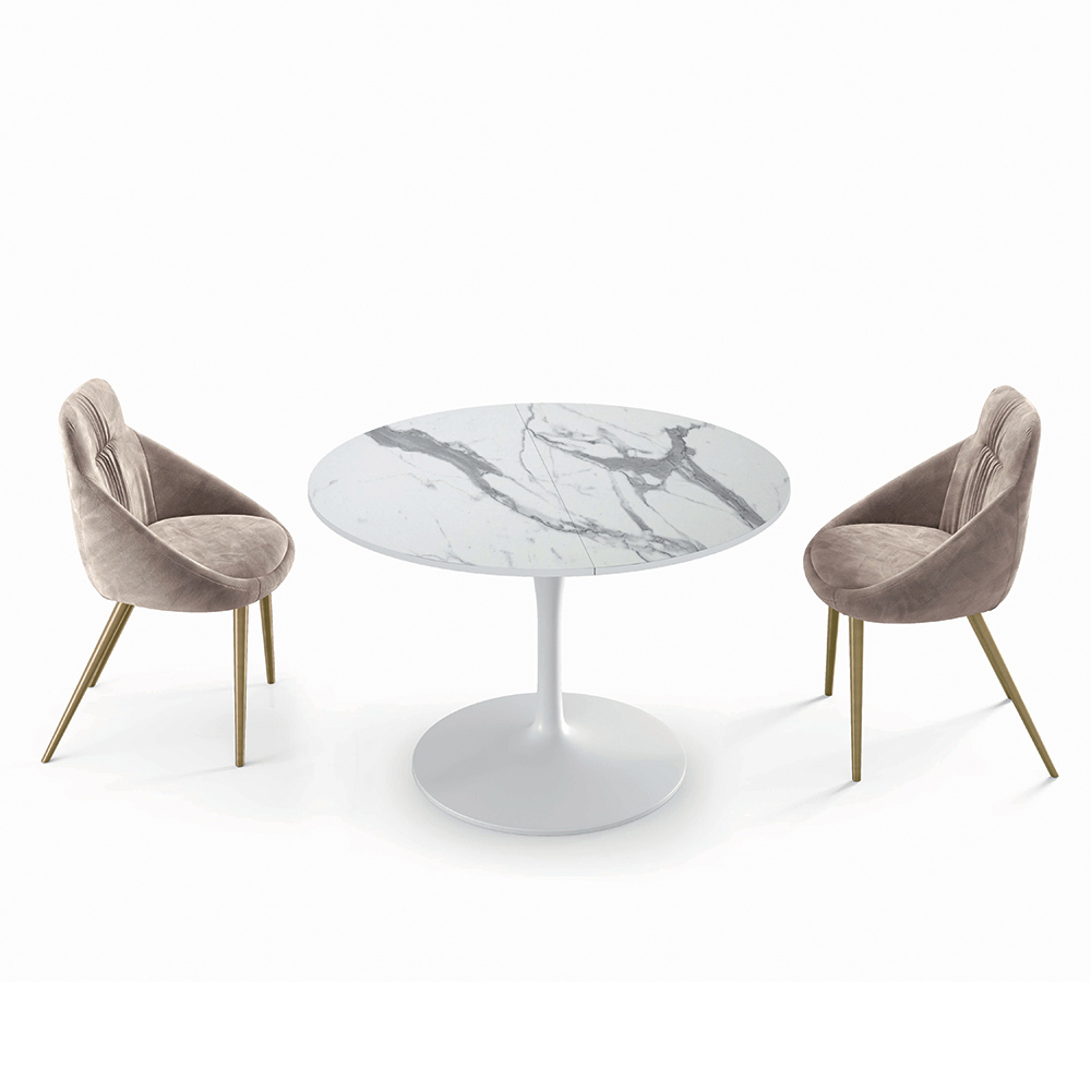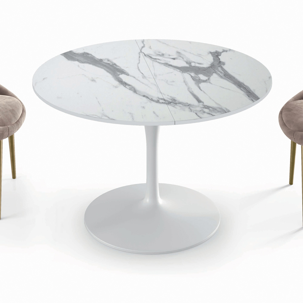 Mesa de salón extensible con extensiones independientes para insertar,tapa en laminado acabado estatuario mate, canto biselado a 45° , base de fundición de aluminio lacado blanco brillo. La cadena de producción, desde la concepción hasta la producción, pasando por el control de calidad, se realiza íntegramente en Italia , para garantizar y preservar las características típicas del "saber hacer" italiano y la importancia del típico Made in Italy. Este producto de estilo moderno tiene como objetivo primordial poder ser utilizado a diario sin renunciar al diseño.