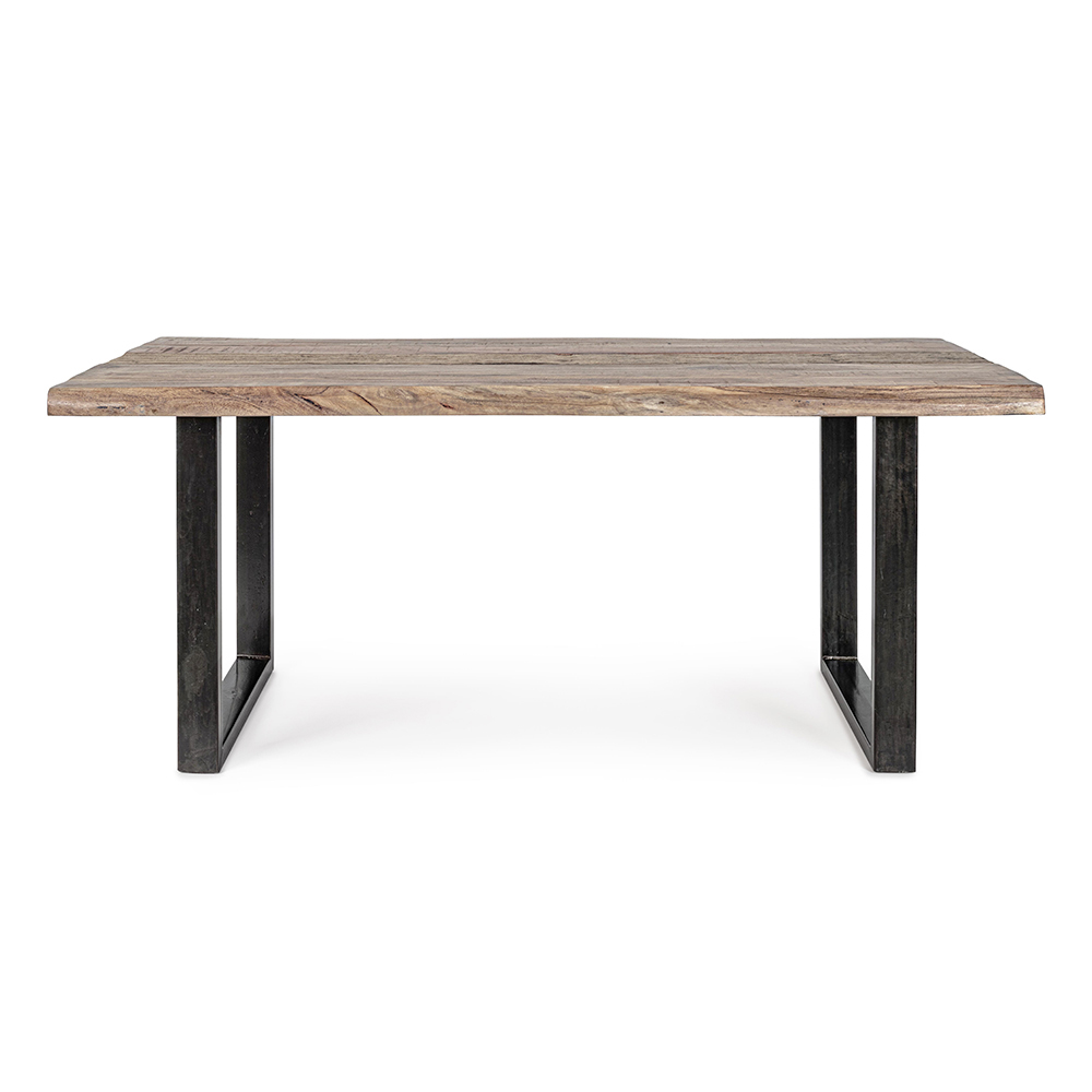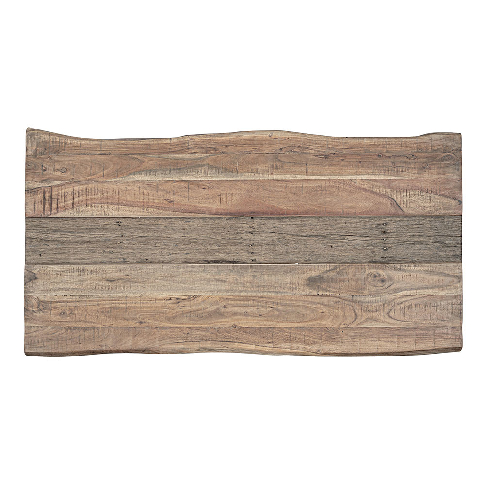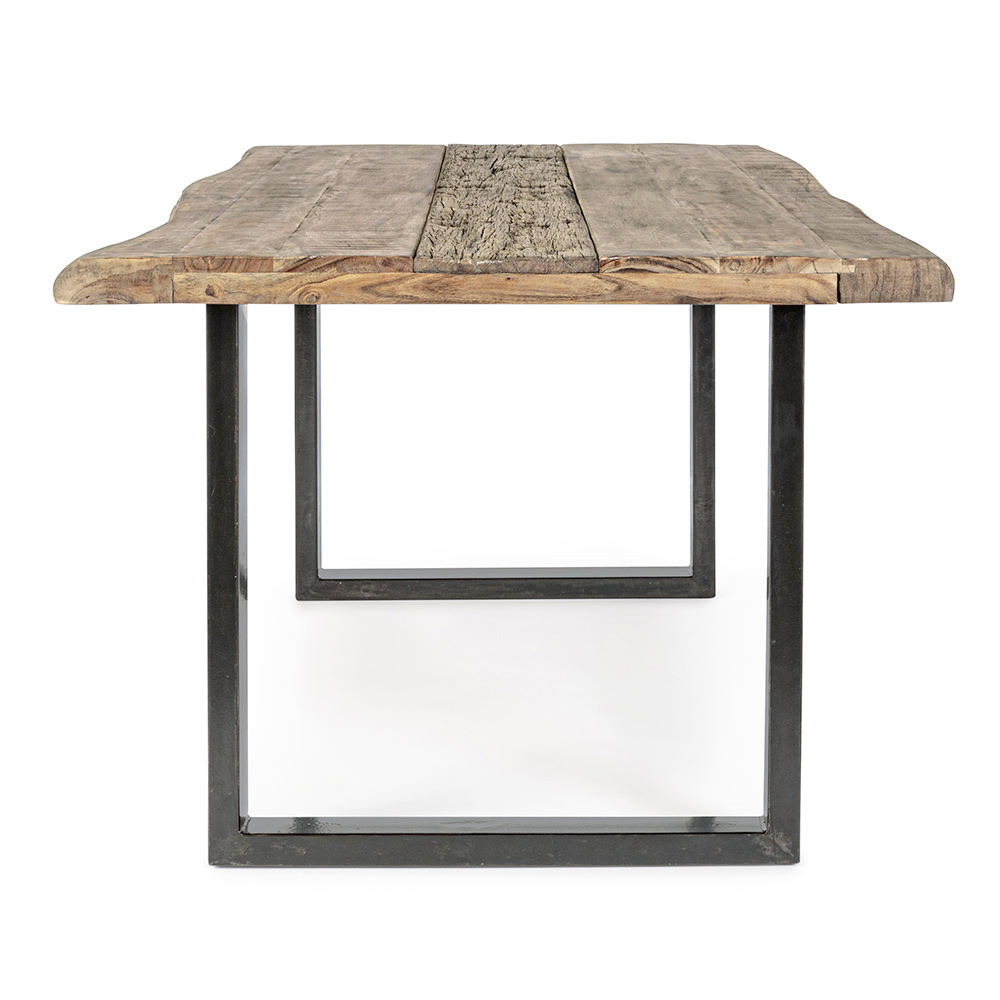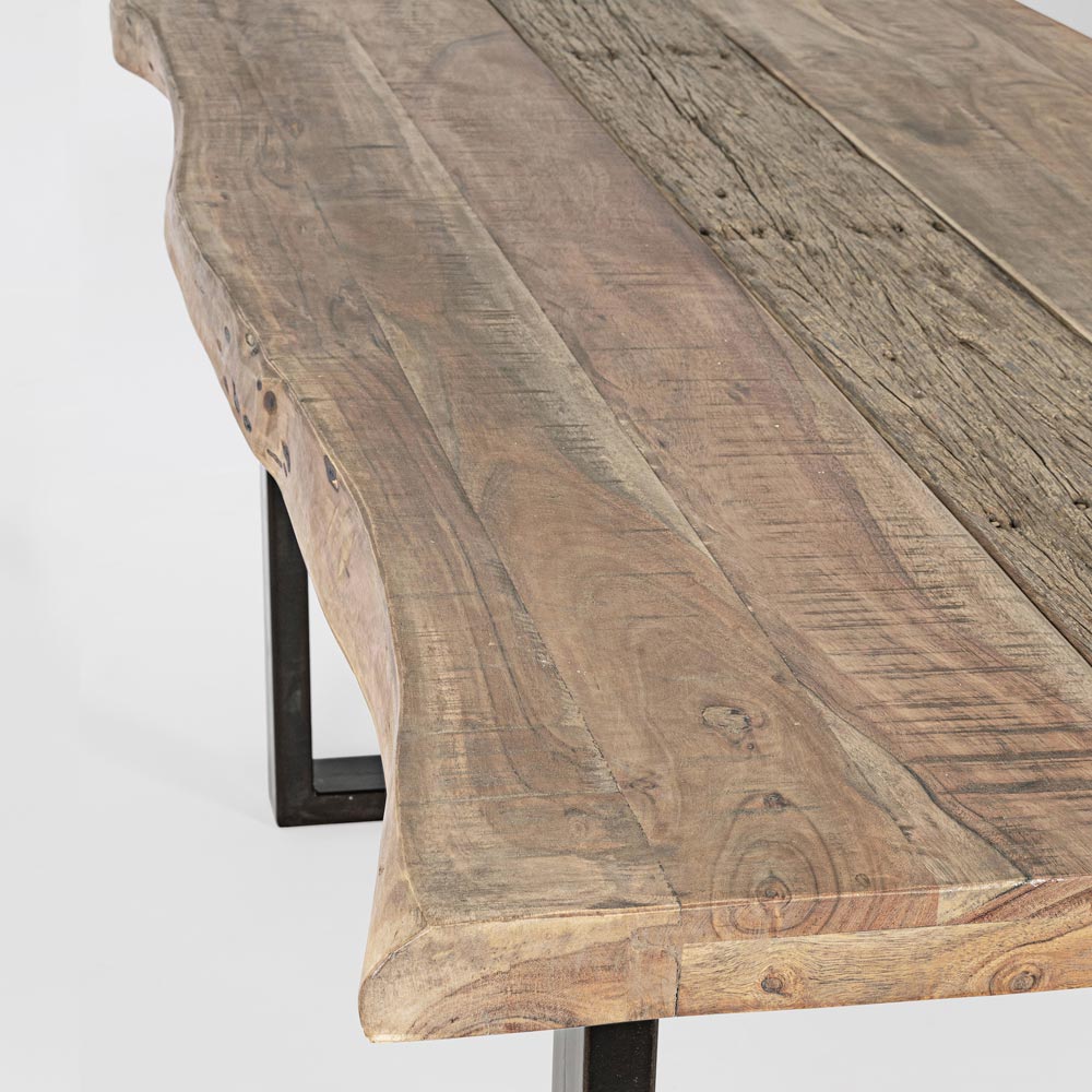 Mesa de comedor en madera de acacia con inserto reciclado y base de acero, 8 personas.