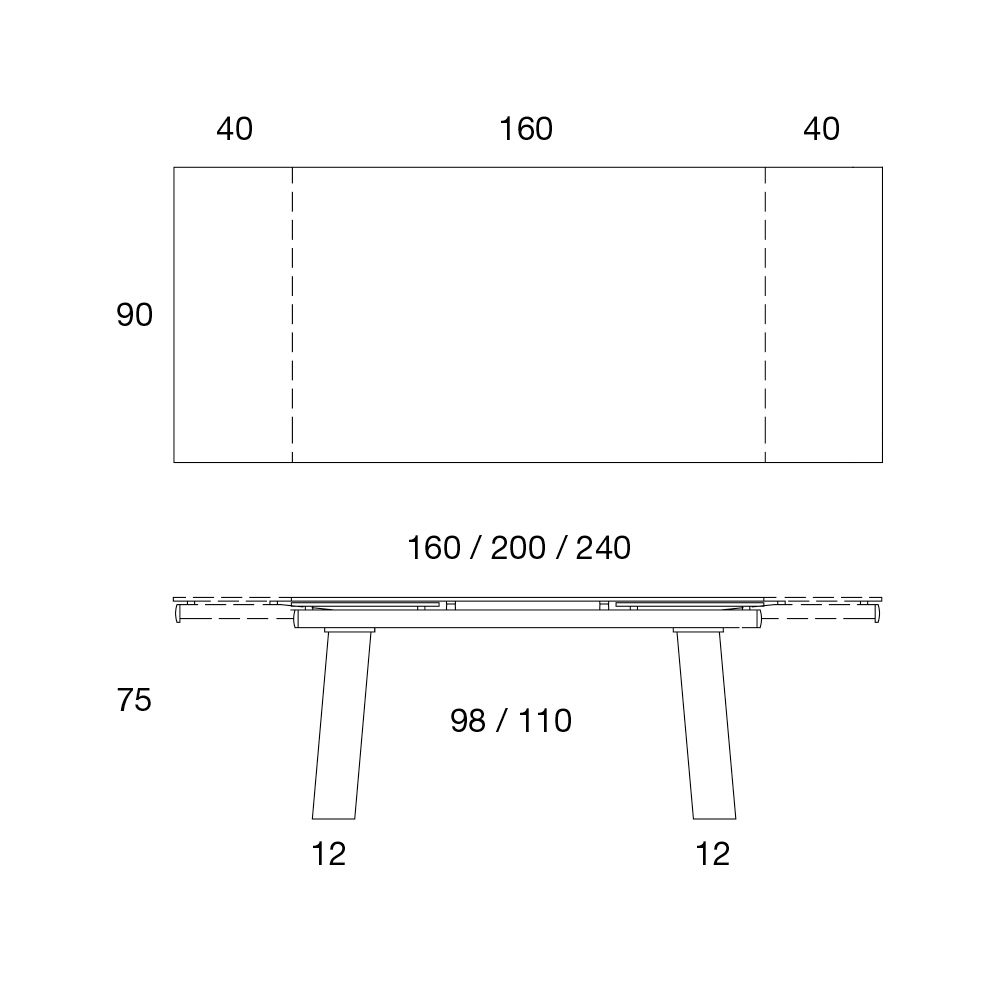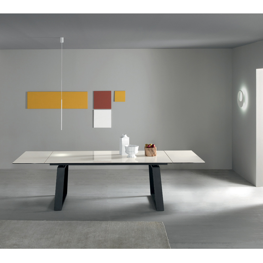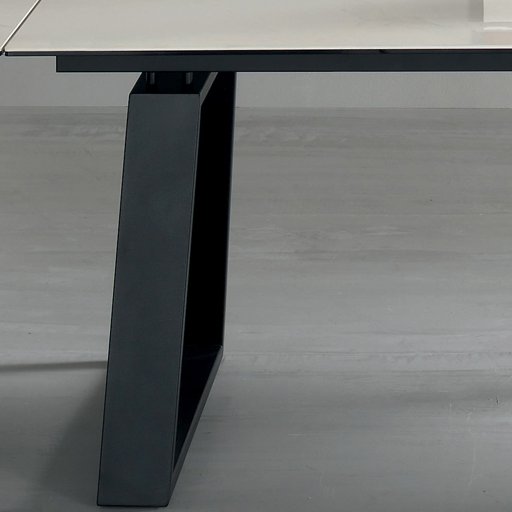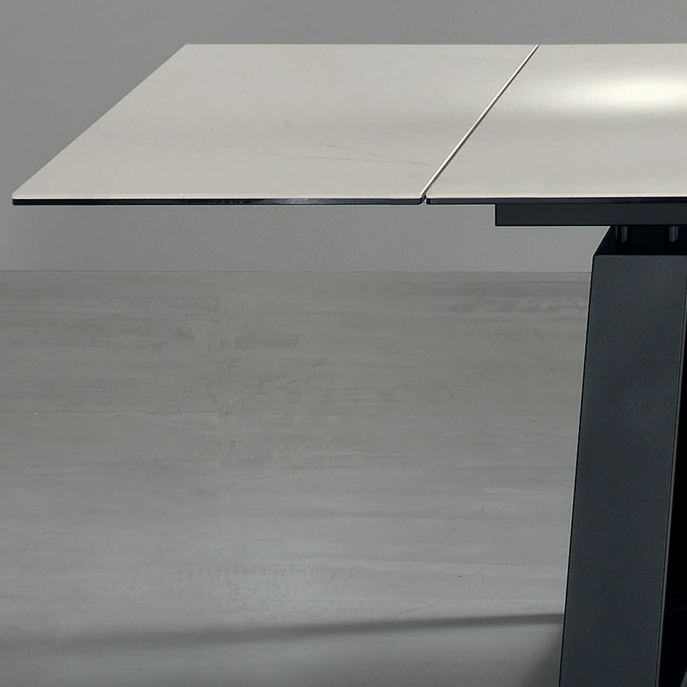 Esta mesa de comedor extensible tiene una estructura con patas trapezoidales enmetal con recubrimiento de polvo negro en relieve y un piso decerámica pulida con 2 extensiones sobre vidrio y marco de aluminio. Su peculiaridad viene dada por la estructura con dos elementos de apoyo al suelo fijos y un diseño que resalta el contraste entre la base y la tapa, especialmente en los acabados. El efecto final hace que la tapa de cerámica parezca flotar sobre la robusta base de metal, dando una atmósfera etérea y elegante.