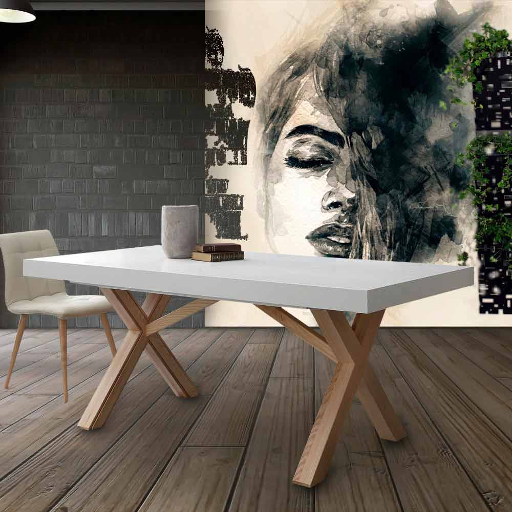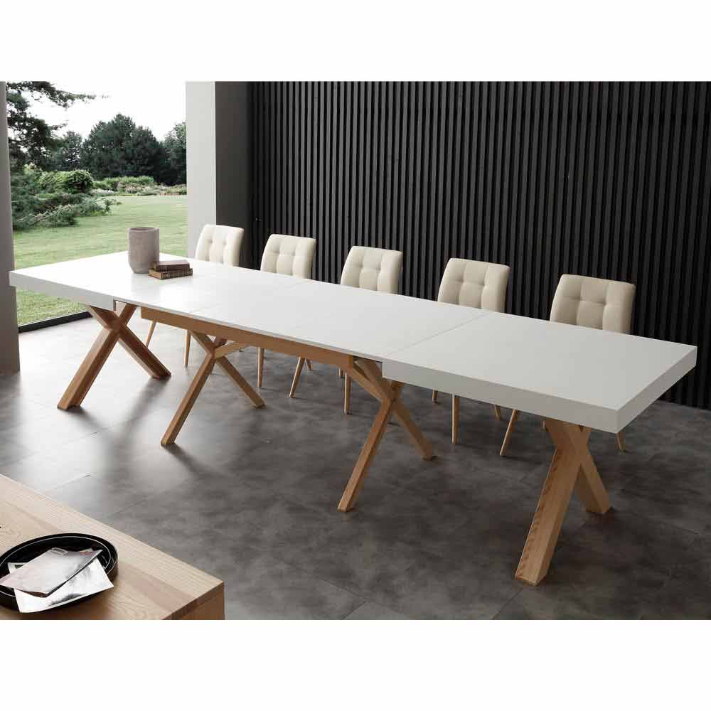 Mesa extensible blanca con estructura de madera maciza natural Rico Rico es una mesa de comedorextensible única en estilo, funcionalidad y diseño.