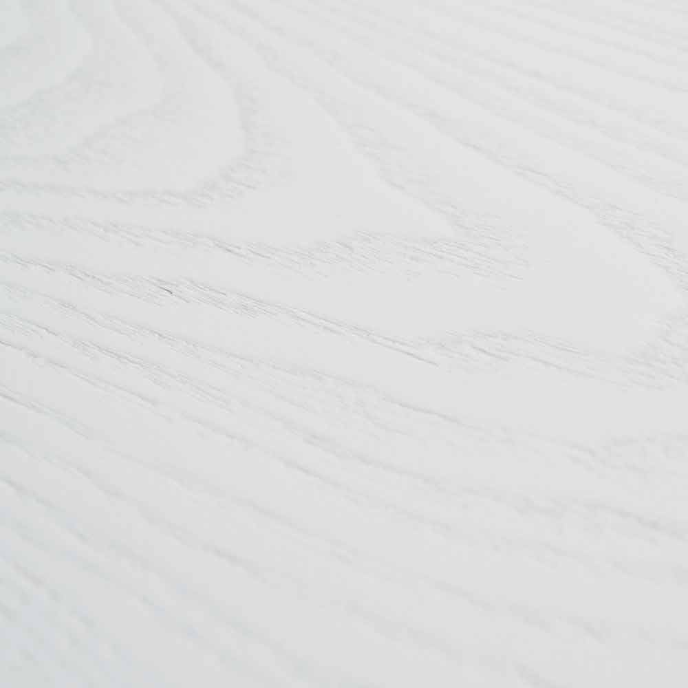 Tiene una estructura de madera maciza de fresno teñido natural y una tapa de chapa de fresno lacada en blanco a poro abierto.