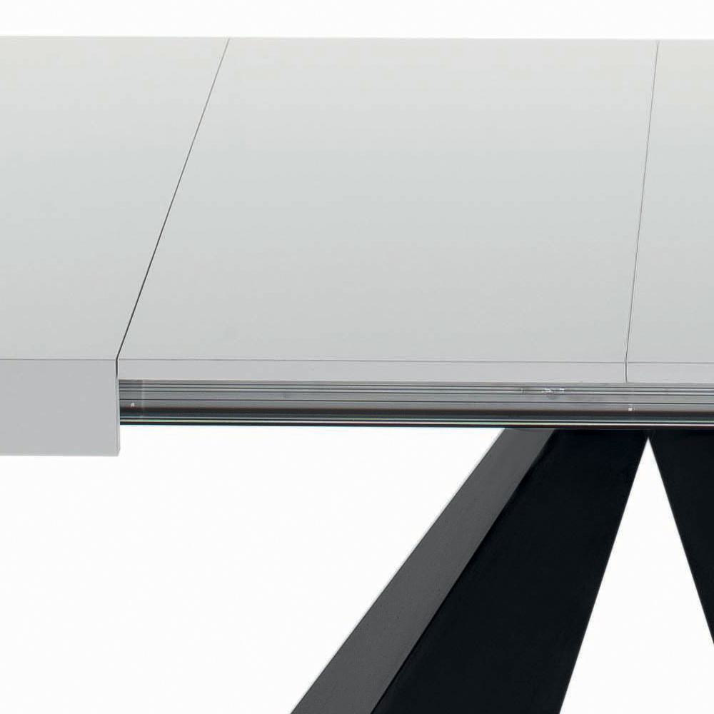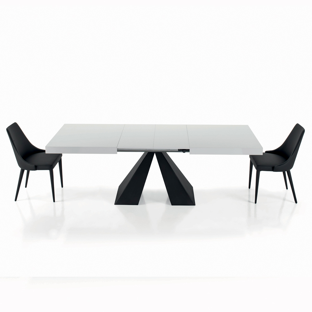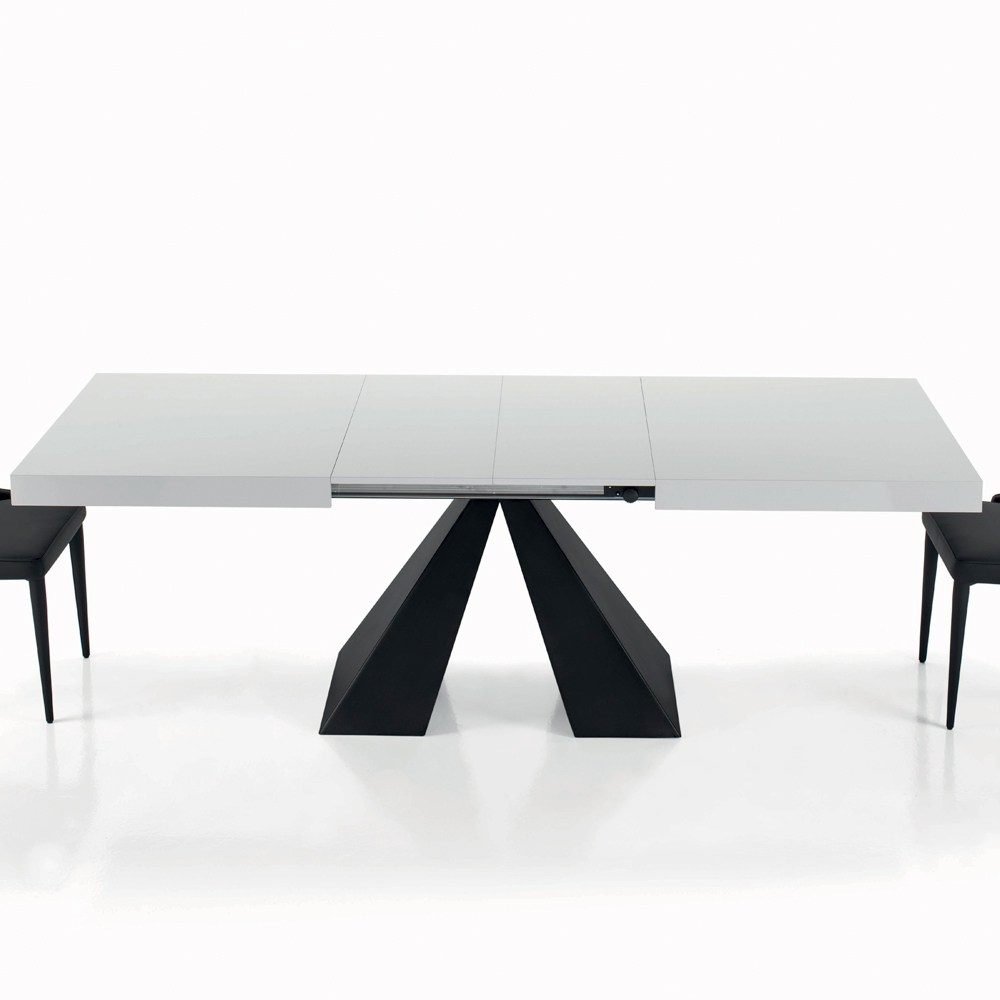Mesa de salón extensible con apertura central sincronizada (extensiones internas), tapa en laminado acabado blanco mate, borde abatible , base de acero lacado en negro y pies regulables. Los artesanos italianos que crearon este producto se comprometieron a elegir los mejores materiales y la precisión en cada detalle para garantizar al cliente una mesa no sólo hermosa sino también funcional y utilizable en diferentes ocasiones . Este elemento es perfecto para decorar cualquier ambiente diario y contract, aportando a la estancia un toque único y elegante.