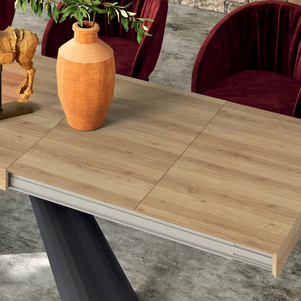 Mesa de salón extensible con apertura lateral sincronizada (extensiones internas) ,tapa en laminado acabado roble natural , borde abatible , base de acero lacado grafito y pies regulables. La elección de materiales de primera calidad y la atención en la creación de cada detalle crean un producto de excelente calidad Made in Italy . Gracias a la forma de la base y a los acabados disponibles, esta mesa es protagonista de cualquier ambiente contract diario , convirtiéndose en una idea perfecta para todos aquellos que quieran darle a la estancia un toque elegante, suntuoso y único.