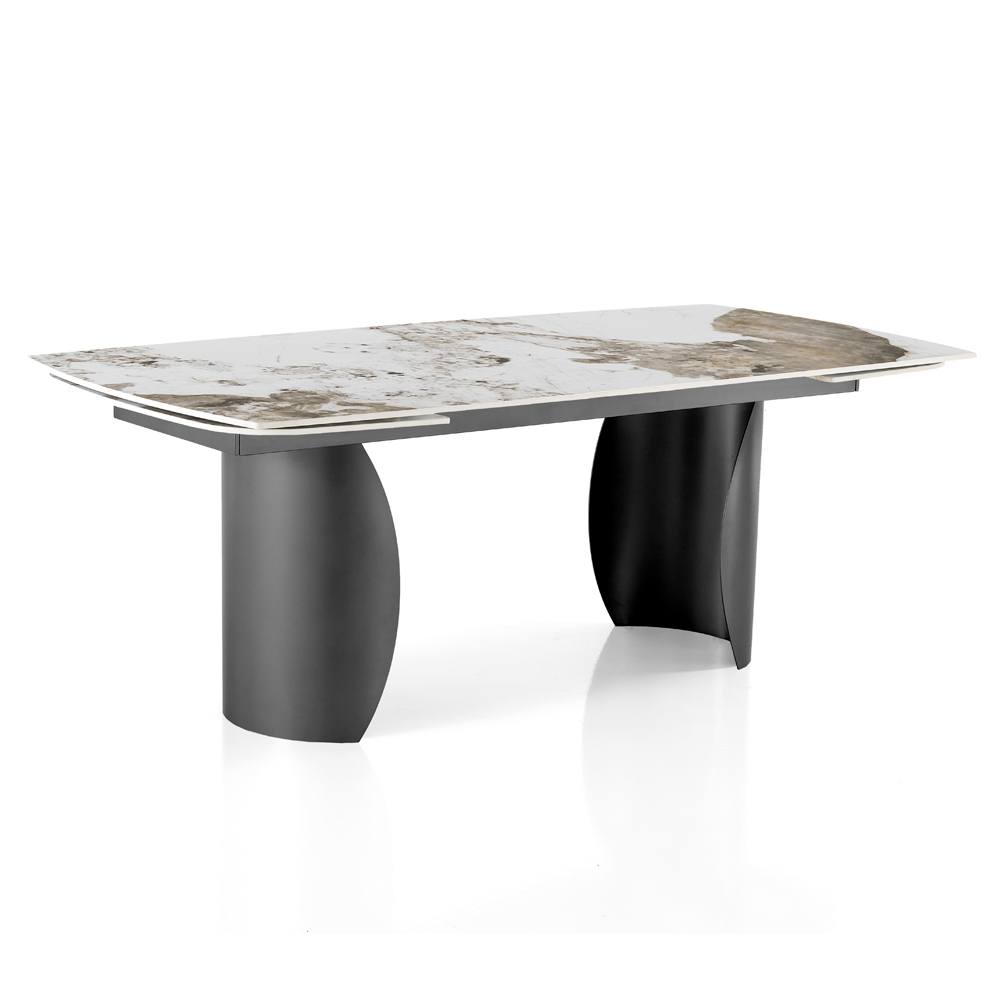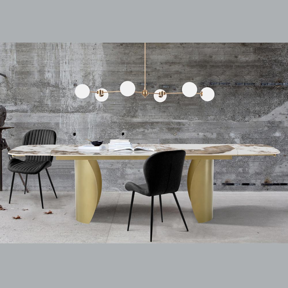 Esta mesa extensible es una expresión sublime de lujo y funcionalidad . La encimera de cerámica efecto mármol, caracterizada por intrincadas vetas multicolores, descansa sobre una doble base, que no sólo aporta estabilidad sino que añade un toque de sofisticada elegancia .