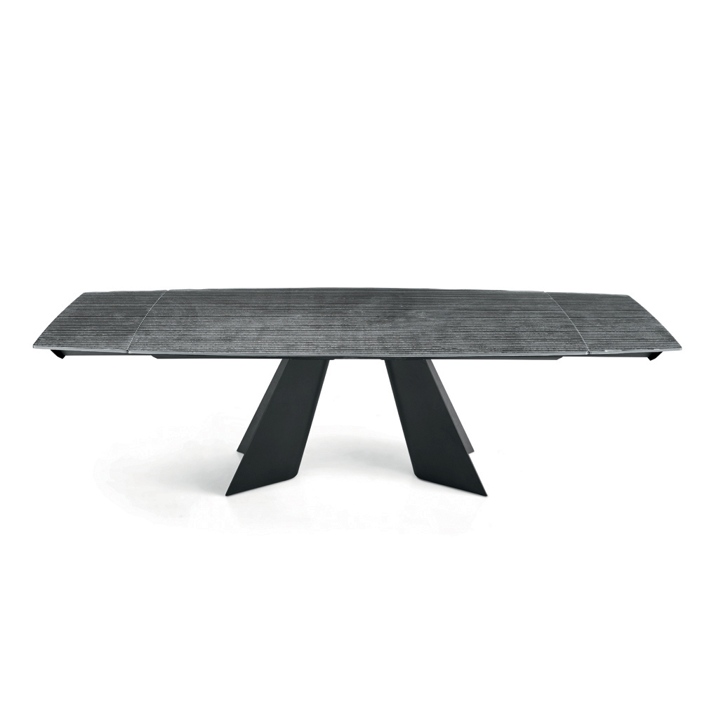La distintiva base de metal pintado se compone de dos elementos delgados en forma de V suave que se estrechan hacia la parte superior, creando una estructura elegante y dinámica. Esta configuración le confiere a la mesa una ligereza visual a la vez que garantiza la estabilidad y solidez de la estructura.